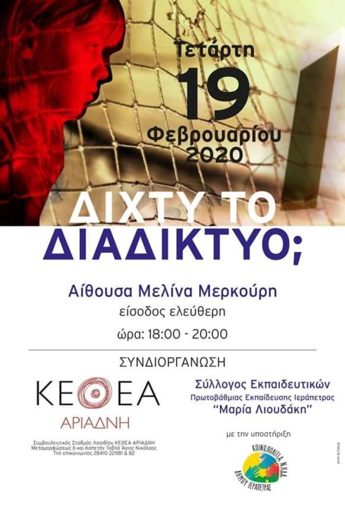 Το Πολυδύναμο Κέντρο Λασιθίου ΚΕΘΕΑ ΑΡΙΑΔΝΗ και ο Σύλλογος Εκπαιδευτικών Πρωτοβάθμιας Εκπαίδευσης Ιεράπετρας «Μαρία Λιουδάκη», με τη υποστήριξη της ΚΟΙΝΩΠΟΛΙΤΙΑ, ΝΠΔΔ του Δήμου Ιεράπετρας, διοργανώνουν εσπερίδα με θέμα: