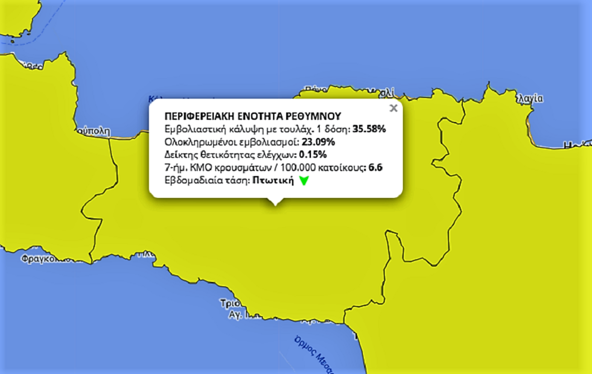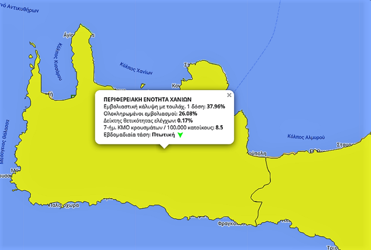 Εμβολιαστική κάλυψη με τουλάχ. 1 δόση: 35.58%Ολοκληρωμένοι εμβολιασμοί: 23.09%Δείκτης θετικότητας ελέγχων: 0.15%7-ήμ. ΚΜΟ κρουσμάτων / 100.000 κατοίκους: 6.6Εβδομαδιαία τάση: Πτωτική