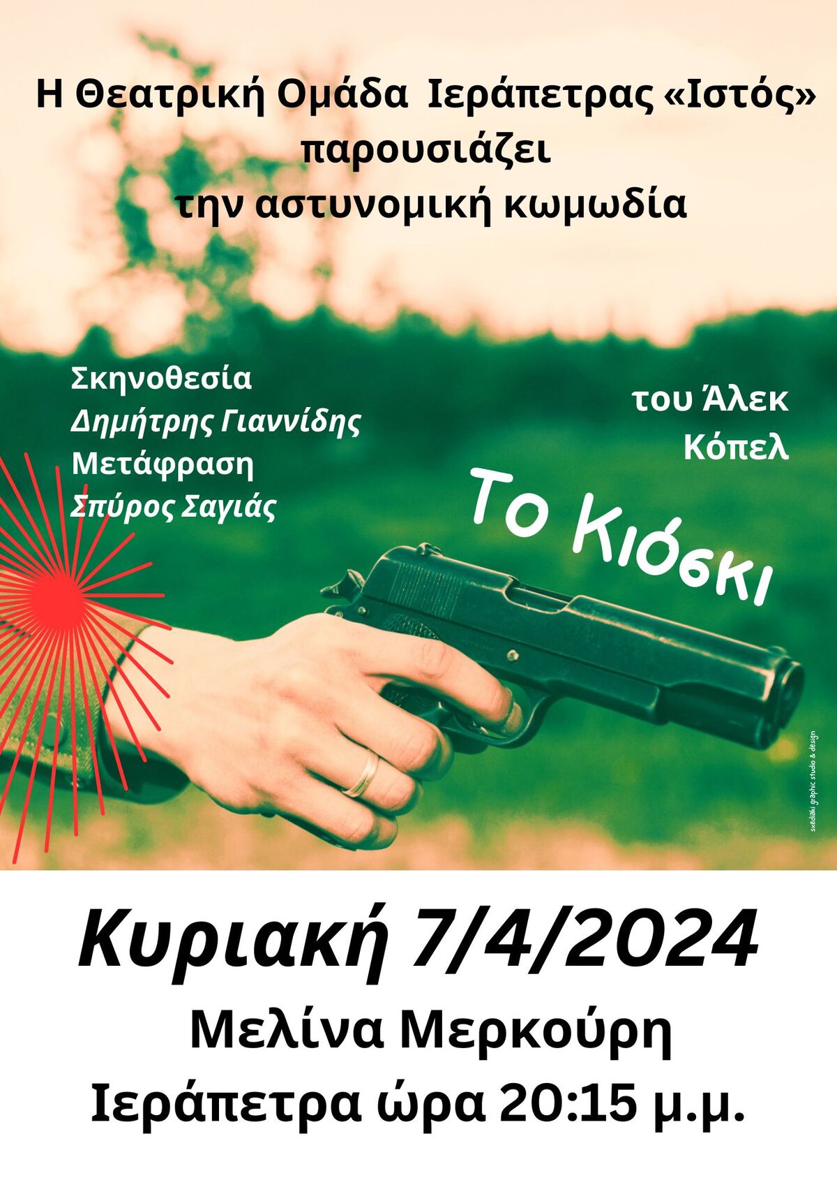 Η αστυνομική κωμωδία «ΤΟ ΚΙΟΣΚΙ» του Άλεκ Κόπελ σε μετάφραση Σπύρου Σαγιά και σκηνοθεσία Δημήτρη Γιαννίδη που παρουσιάζει η Θεατρική Ομάδα Ιεράπετρας «Ιστός» - Θέατρο Αλληλεγγύης, θα ανέβει ξανά στην σκηνή της αίθουσας «Μελίνα Μερκούρη» στην Ιεράπετρα την Κυριακή 7 Απριλίου και ώρα 20.15.