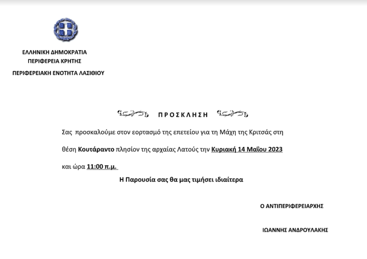 Την Κυριακή 14 Μαΐου στις 11.00 - Η πρόσκληση από τον Αντιπεριφερειάρχη Λασιθίου Ι. Ανδρουλάκη