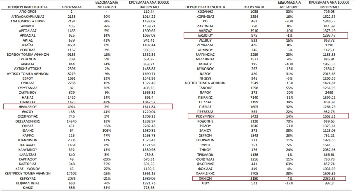 Στον ακόλουθο πίνακα παρουσιάζεται τo σύνολο των κρουσμάτων, η επίπτωση ανά 100.000 πληθυσμού καθώς και η εβδομαδιαία μεταβολή των επιβεβαιωμένων κρουσμάτων COVID-19 ανά περιφερειακή ενότητα την εβδομάδα αναφοράς σε σύγκριση με την προηγούμενη εβδομάδα.