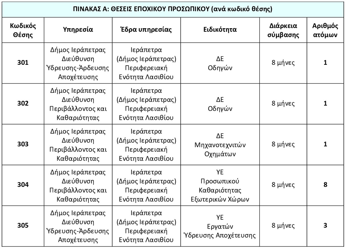 Ο Δήμος Ιεράπετρας ανακοινώνει την πρόσληψη, με σύμβαση εργασίας ιδιωτικού δικαίου ορισμένου χρόνου, δεκατεσσάρων (14) ατόμων, για την κάλυψη αναγκών ανταποδοτικού χαρακτήρα του Δήμου Ιεράπετρας. Πιο συγκεκριμένα: