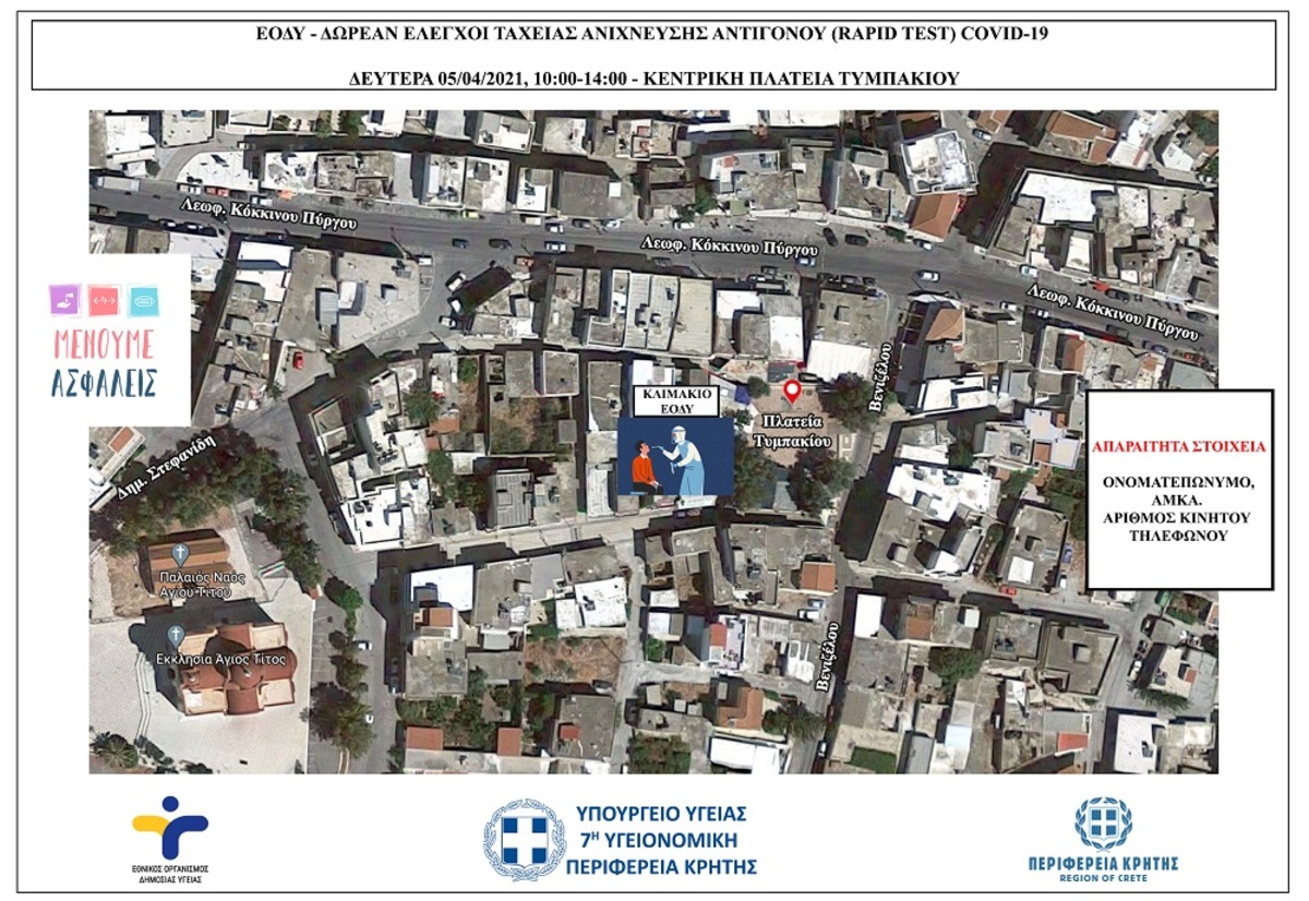 Οι δειγματοληψίες διεξάγονται στην Κεντρική πλατεία Τυμπακίου, έως τις 14:00, όπως απεικονίζεται στον χάρτη.