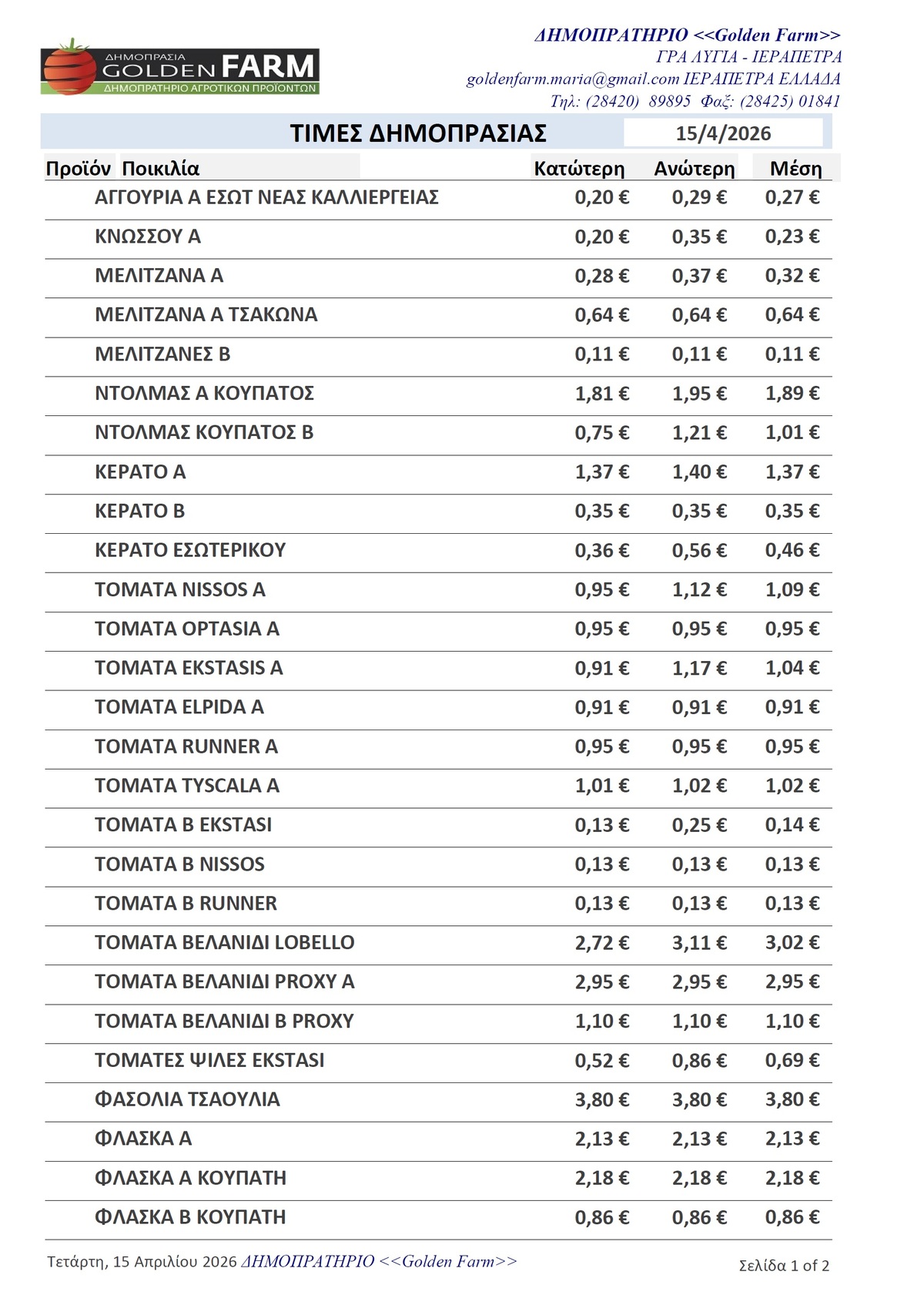 ΤΙΜΕΣ 01:43 μ.μ. - 08/04/2026 GOLDEN FARM |Τιμές Αγροτικών Προϊόντων 08.04.2026 ΙΕΡΑΠΕΤΡΑ, ΙΕΡΑΠΕΤΡΑ , ΔΗΜΟΠΡΑΤΗΡΙΟ, ΚΗΠΕΥΤΙΚΑ , GOLDEN FARM Δείτε τις σημερινές τιμές του δημοπρατηρίου