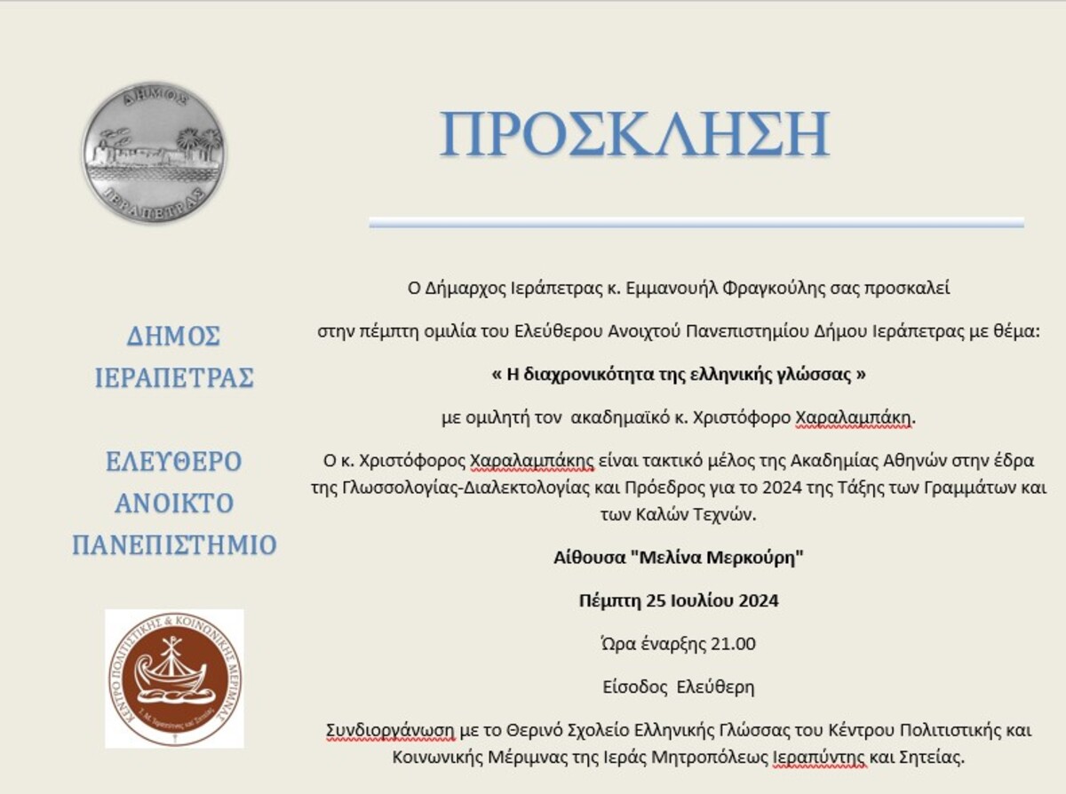 "Η διαχρονικότητα της ελληνικής γλώσσας" το επόμενο θέμα του Ανοιχτού Πανεπιστημίου Δήμου Ιεράπετρας ΛΑΣΙΘΙ ΙΕΡΑΠΕΤΡΑ 12:15 μ.μ. - Τρίτη 23 Ιουλίου 2024 12:07 μ.μ. - Τρί, 23/15/2024 ΙΕΡΑΠΕΤΡΑ, ΑΝΟΙΧΤΟ ΠΑΝΕΠΙΣΤΗΜΙΟ , ΧΑΡΑΛΑΜΠΑΚΗΣ, ΟΜΙΛΗΤΗΣ Με ομιλητή τον ακαδημαϊκό κ. Χριστόφορο Χαραλαμπάκη - Την Πέμπτη 25 Ιουλίου