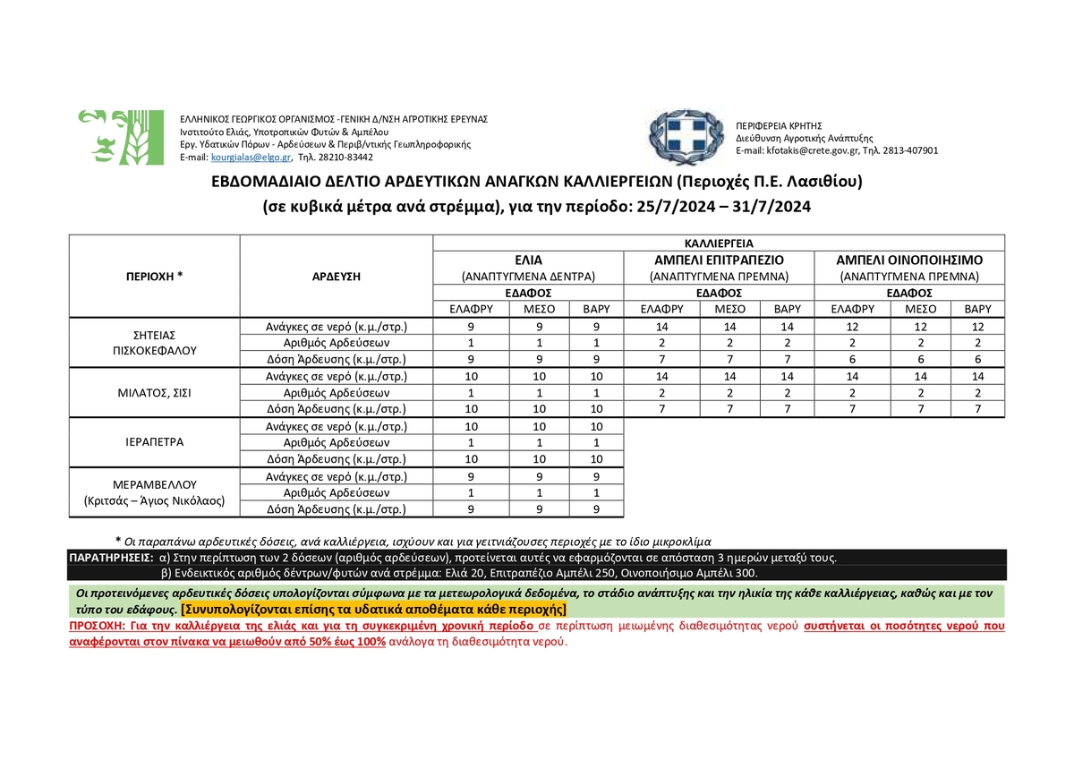 Το αρδευτικό δελτίο για την Π.Ε. Λασιθίου ΛΑΣΙΘΙ ΙΕΡΑΠΕΤΡΑ 10:28 π.μ. - Πέμπτη 25 Ιουλίου 2024 10:07 π.μ. - Πέμ, 25/28/2024 ΛΑΣΙΘΙ, ΔΕΛΤΙΟ ΑΡΔΕΥΣΗΣ Από 25/07 έως 31/07/2024 Η Περιφέρεια Κρήτης σε συνεργασία με το Ινστιτούτο Ελιάς Υποτροπικών Φυτών & Αμπέλου του ΕΛΓΟ-ΔΗΜΗΤΡΑ κοινοποιεί το 16ο Ενημερωτικό Δελτίο Άρδευσης, για την περίοδο από 25/07 έως 31/07/2024.