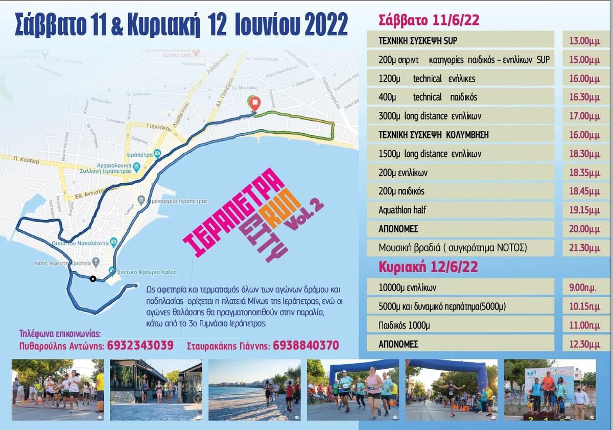 Ένα 2ήμερο γεμάτο αγώνες , μουσική και διασκέδαση, τόσο μέσα στους δρόμους της πόλης όσο και στην θάλασσα . Αγώνες για όλες τις ηλικίες , γα αρχάριους και elite . Κολύμπι ή τρέξιμο, περπάτημα καθώς και sup . Πολλοί εθελοντές θα φροντίσουν όλα να κυλήσουν ομαλά , ενώ το Σάββατο το βράδυ στο αμφιθέατρο του Μίνως το συγκρότημα ΝΟΤΟΣ θα μας διασκεδάσει !!!