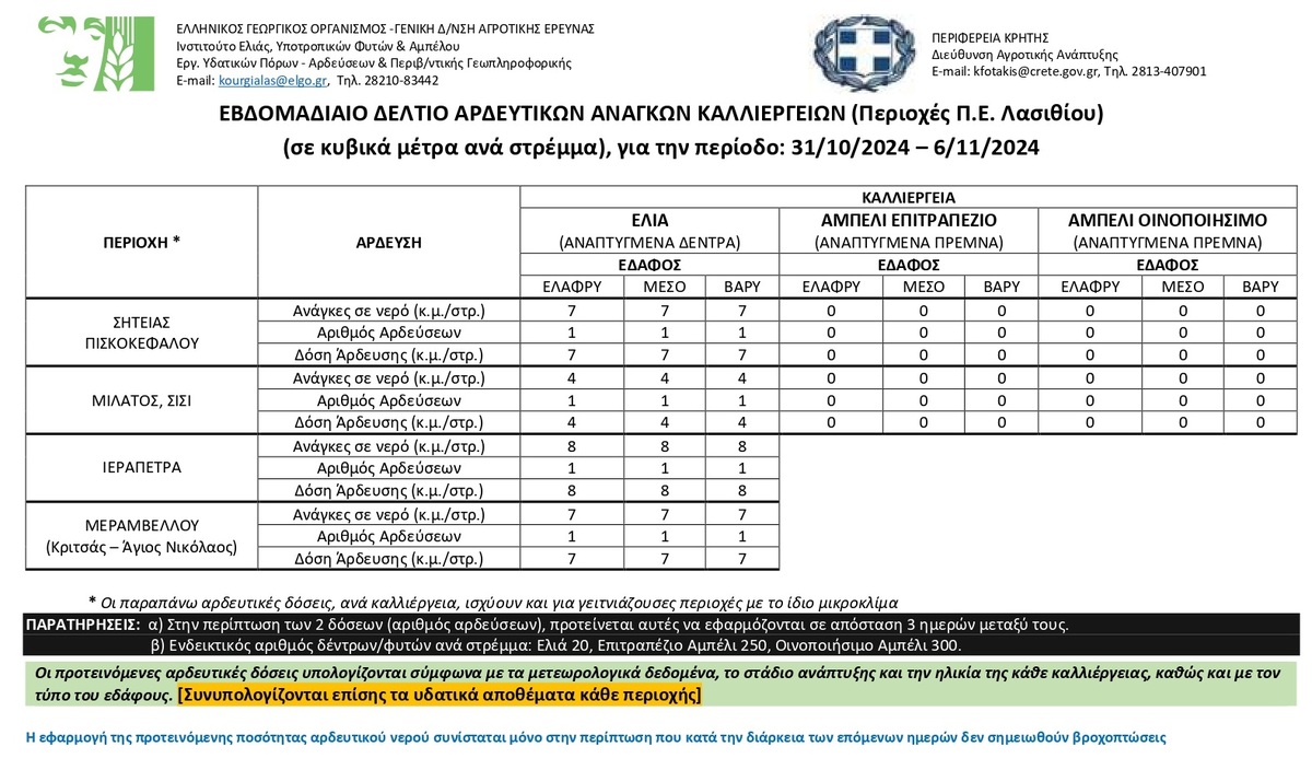 Το αρδευτικό δελτίο για την Π.Ε. Λασιθίου ΛΑΣΙΘΙ ΙΕΡΑΠΕΤΡΑ 10:47 π.μ. - Πέμπτη 31 Οκτωβρίου 2024 10:10 π.μ. - Πέμ, 31/47/2024 ΛΑΣΙΘΙ, ΔΕΛΤΙΟ ΑΡΔΕΥΣΗΣ Από 31/10 έως 06/11/2024 Η Περιφέρεια Κρήτης σε συνεργασία με το Ινστιτούτο Ελιάς Υποτροπικών Φυτών & Αμπέλου του ΕΛΓΟ-ΔΗΜΗΤΡΑ κοινοποιεί το 30ο Ενημερωτικό Δελτίο Άρδευσης, για την περίοδο από 31/10 έως 06/11/2024.