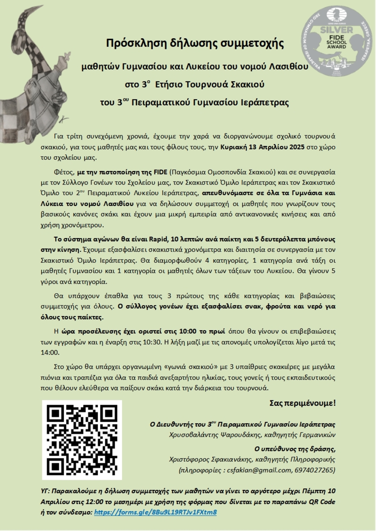 Φέτος, με την πιστοποίηση της FIDE (Παγκόσμια Ομοσπονδία Σκακιού) και σε συνεργασία με τον Σύλλογο Γονέων του Σχολείου μας, τον Σκακιστικό Όμιλο Ιεράπετρας και τον Σκακιστικό Όμιλο του 2ου Πειραματικού Λυκείου Ιεράπετρας, απευθυνόμαστε σε όλα τα Γυμνάσια και Λύκεια του νομού Λασιθίου για να δηλώσουν συμμετοχή οι μαθητές που γνωρίζουν τους βασικούς κανόνες σκάκι και έχουν μια μικρή εμπειρία από αντικανονικές κινήσεις και από χρήση χρονόμετρου.