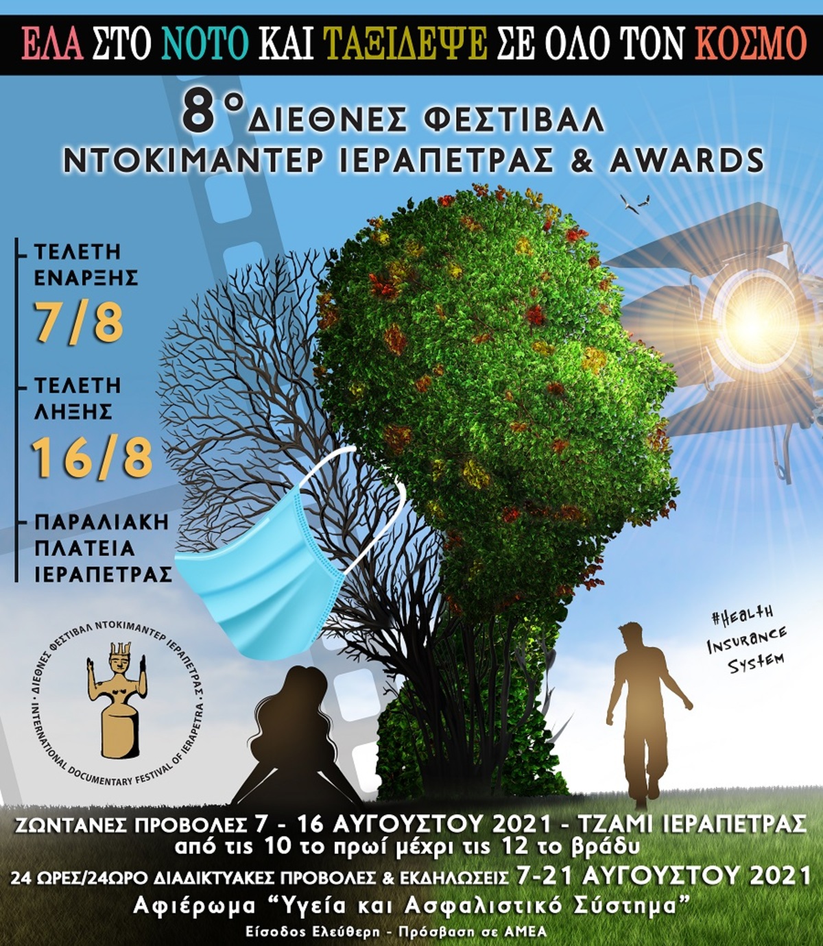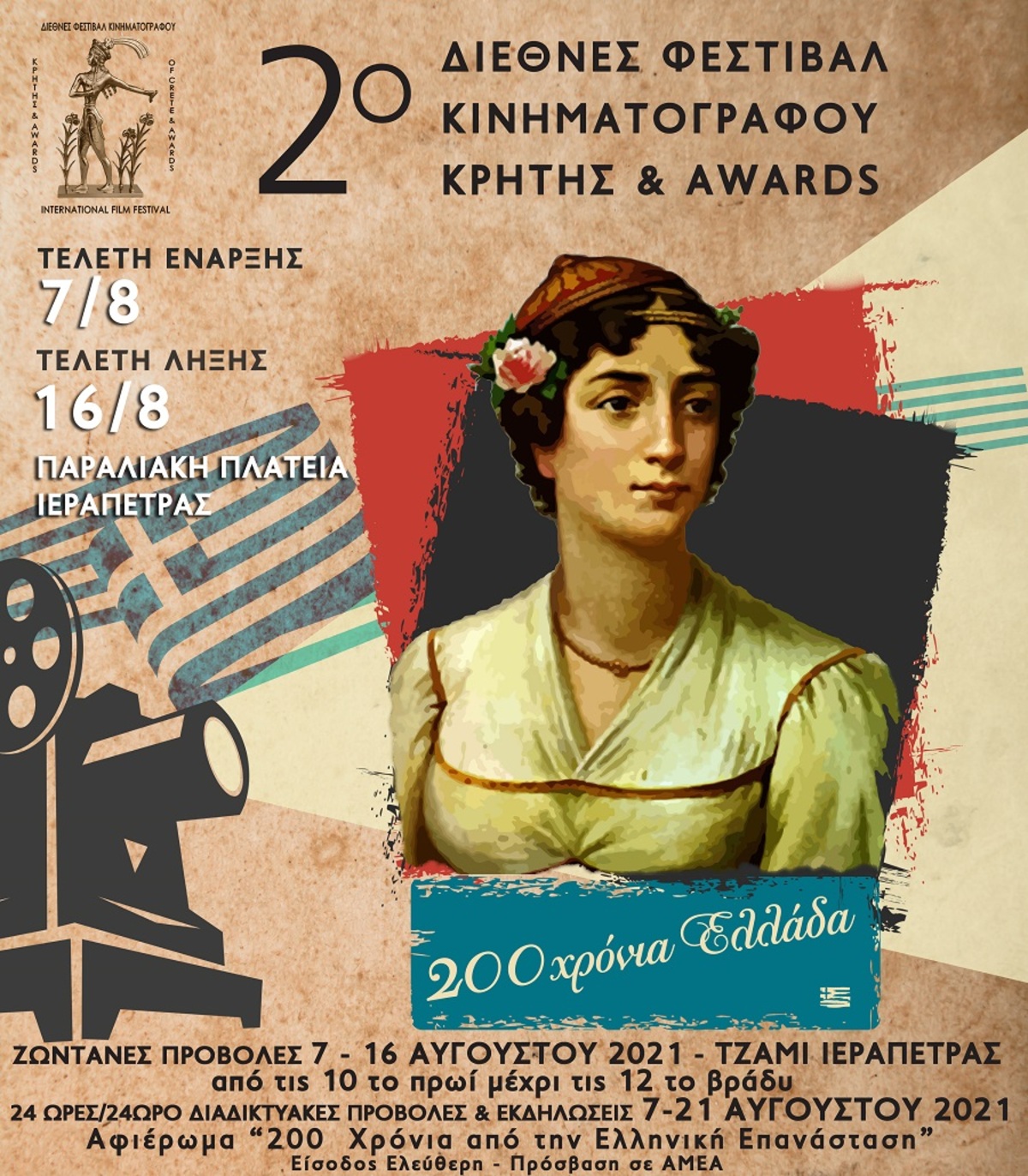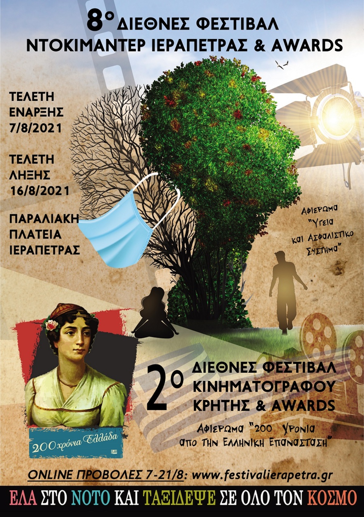 Φέτος, το “8ο Διεθνές Φεστιβάλ Ντοκιμαντέρ Ιεράπετρας & Awards” είναι αφιερωμένο στην Υγεία και το Ασφαλιστικό Σύστημα και στην Τελετή Έναρξης θα προβληθεί το νέο ντοκιμαντέρ της Ελένης Βλάσση Πανδημία, ενώ το “2ο Διεθνές Φεστιβάλ Κινηματογράφου Κρήτης & Awards” είναι αφιερωμένο στα 200 χρόνια από την Ελληνική Επανάσταση και θα παρουσιάσει τη ταινία “Το Ανίκητο πλοίο της Επανάστασης”( που προβάλετε στο ημερολόγιο δράσεων της επιτροπής Ελλάδα 2021). Παράλληλα, υπό την αιγίδα των δύο Φεστιβάλ θα διεξαχθούν το “2ο Φεστιβάλ Γαστρονομίας Ανατολικής Κρήτης” με την Καίτη Παπαδάκη και το Λεωνίδα Κουδουμογιαννάκη, καθώς και το “2ο Φεστιβάλ Μουσικής” με ντόπιους και ξένους καλλιτέχνες, την Πέμπτη 12 Αυγούστου και ώρα 9 το βράδυ στην Παραλιακή Πλατεία Ιεράπετρας.
