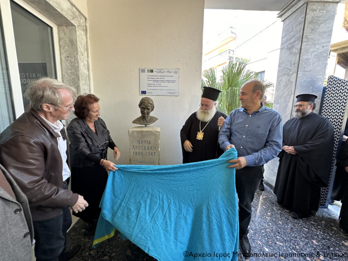 Μετά το πέρας της Αρχιερατικής Θείας Λειτουργίας προσφέρθηκε καφές και κεράσματα στην αίθουσα εκδηλώσεων του ναού. Ακολούθησαν τα αποκαλυπτήρια της προτομής της αείμνηστης δασκάλας Μαρίας Λιουδάκη, στην είσοδο της ομώνυμης Δημοτικής Βιβλιοθήκης Ιεράπετρας, που φιλοτέχνησε ο Άγγλος γλύπτης Nigel Ratcliffe, που διαμένει μόνιμα στην Κριτσά, ενώ τη βάση ο συντοπίτης μας γλύπτης Μιχάλης Βουζουνεράκης, με δαπάνες της Περιφέρειας Κρήτης.