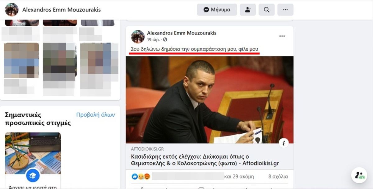 Ο Αλέξανδρος Μουζουράκης λίγες μέρες πριν το πογκρόμ στο Τυμπάκι (που κατέληξε σε ξυλοδαρμούς μεταναστών και σπάσιμο των χώρων λατρείας τους) είχε συννατηθεί με τον Ηλία Κασιδιάρη, χαρακτηρίζοντας τον ίδιο «φίλο του» και τη συνάντησή τους πολύ εποικοδομητική. Σε σημερινή του μάλιστα ανάρτηση στο facebook, ο συγκεκριμένος δηλώνει δημόσια τη συμπαράστασή του στον καταδικασμένο πλέον, σε 13 χρόνια φυλακή για διεύθυνση εγκληματικής οργάνωσης, Ηλία Κασιδιάρη.