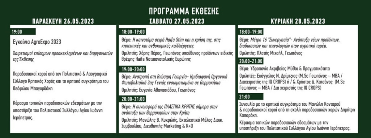 Εγκαινιάζεται σήμερα η αγροτική έκθεση Ιεράπετρας AgroExpo 2023 που θα πραγματοποιηθεί στον χώρο της πρώην ΑΓΡΕΞ και θα διαρκέσει μέχρι την Κυριακή 28 Μαΐου. Η έκθεση θα ανοίξει τις πύλες της σήμερα Παρασκευή στις 4.00 το μεσημέρι και στις7.00 το απόγευμα θα γίνουν τα εγκαίνια παρουσία επισήμων, Βουλευτών, Περιφερειάρχη Κρήτης, Δημάρχου Ιεράπετρας κ.α.
