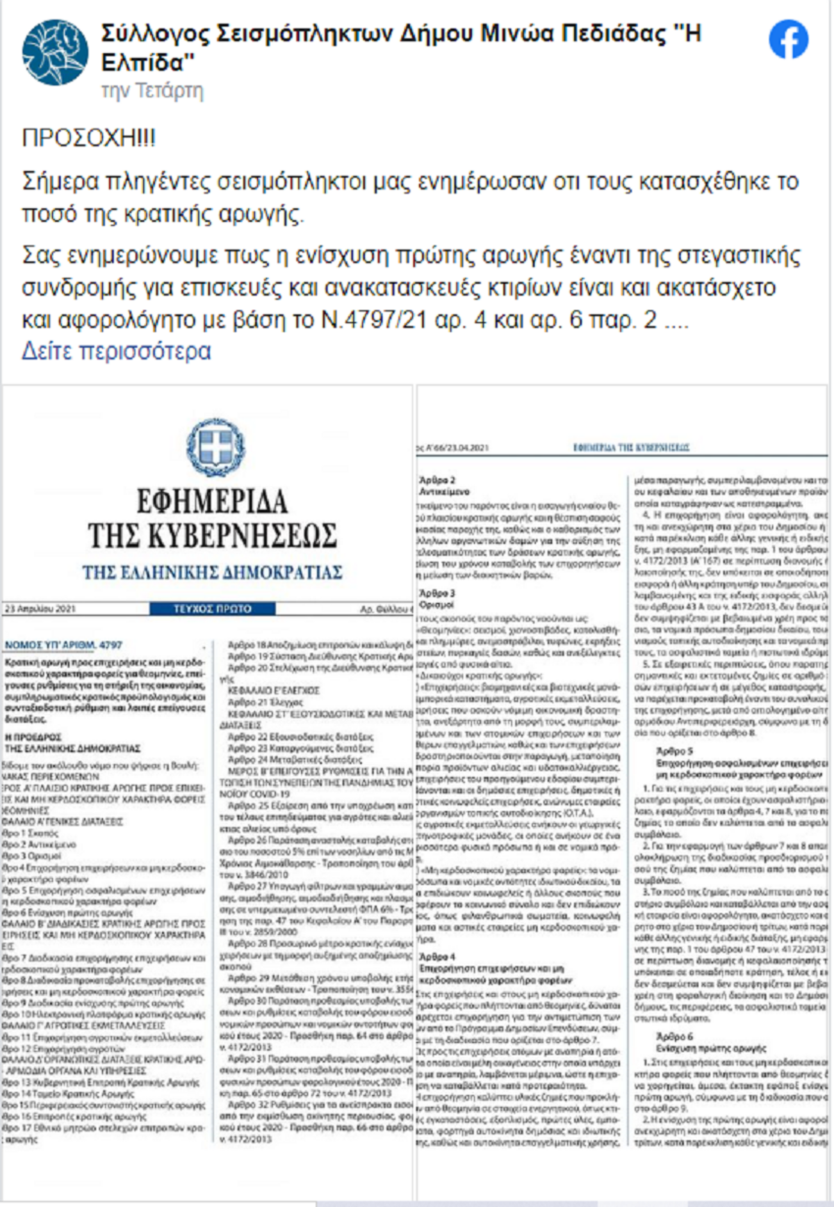 Όπως καταγγέλλει ο Σύλλογος Σεισμόπληκτων Δήμου Μινώα Πεδιάδας “Η Ελπίδα”, πληγέντες σεισμόπληκτοι ενημερώνουν τους εκπροσώπους του ότι τους κατασχέθηκε το ποσό της κρατικής αρωγής από τους τραπεζικούς λογαριασμούς τους.