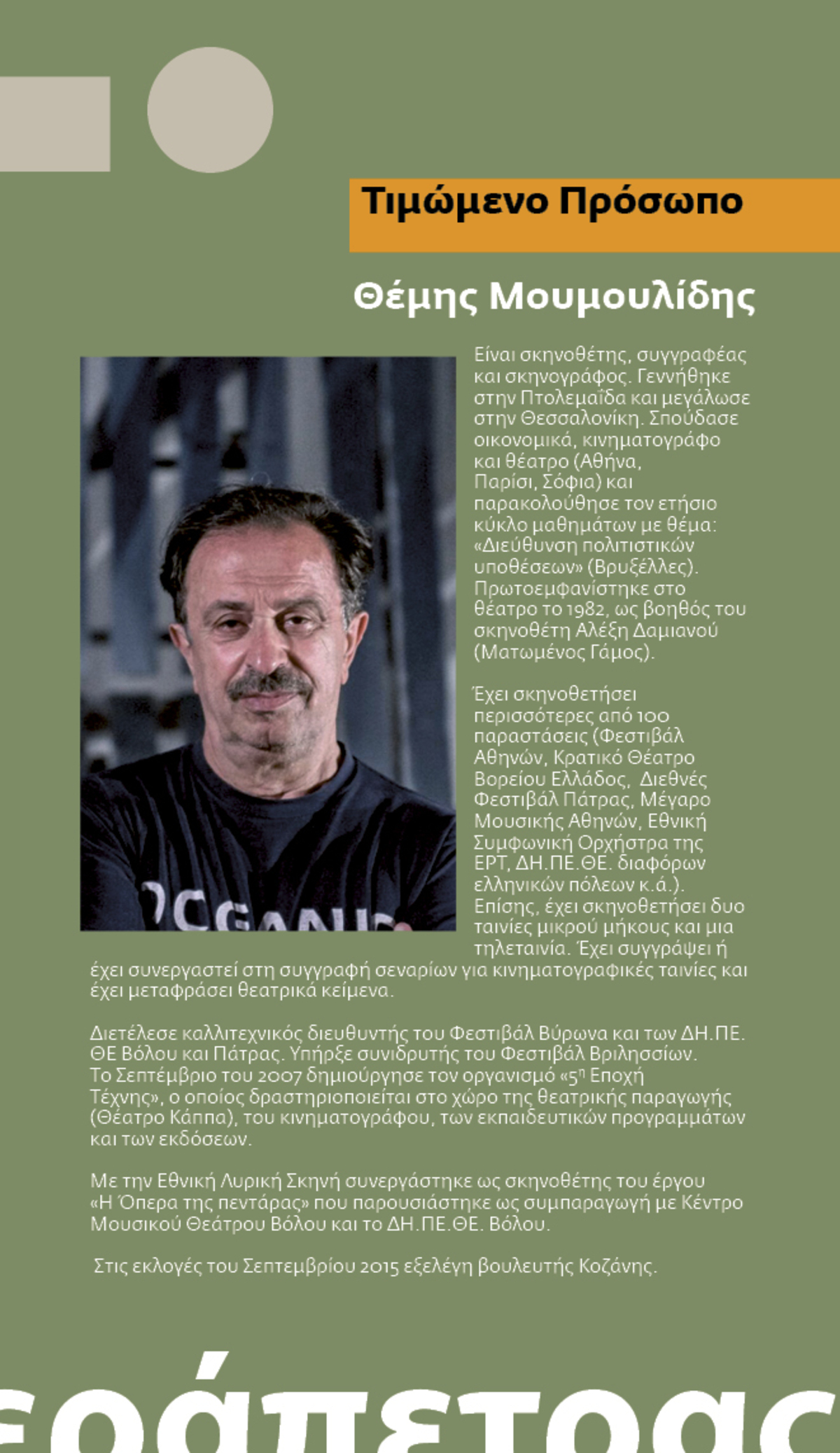 Το 12ο Πανελλήνιο Φεστιβάλ Ερασιτεχνικού Θεάτρου Ιεράπετρας τιμά απόψε στις 21:00 στο θέατρο Μελίνα Μερκούρη, τον διακεκριμένο σκηνοθέτη, συγγραφέα και σκηνογράφο, Θέμη Μουμουλίδη.