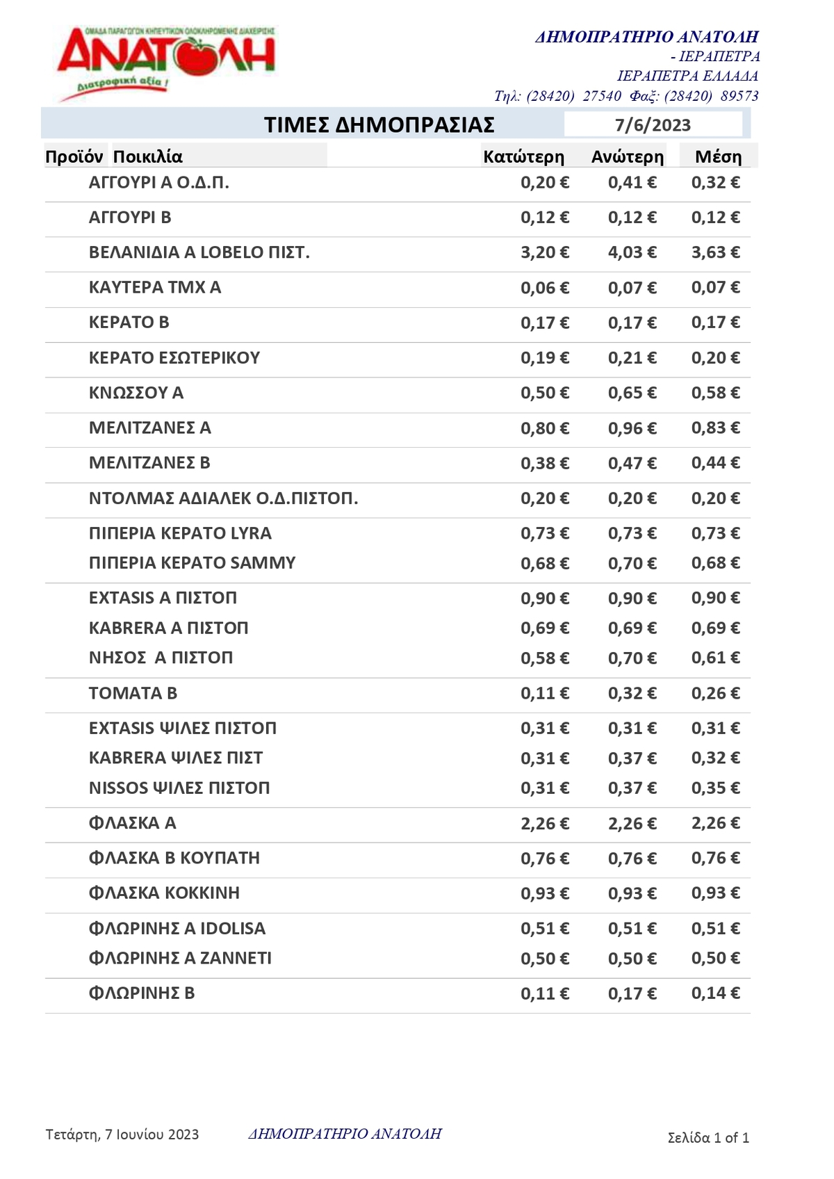 Α.Σ. ΑΝΑΤΟΛΗ | Τιμές Αγροτικών Προϊόντων 07-06-2023 ΤΙΜΕΣ 12:27 μ.μ. - Τετάρτη 7 Ιουνίου 2023 12:06 μ.μ. - Τετ, 07/27/2023 ΙΕΡΑΠΕΤΡΑ, ΤΙΜΕΣ ΑΓΡΟΤΙΚΩΝ ΠΡΟΙΟΝΤΩΝ, ΔΗΜΟΠΡΑΣΙΑ, Α.Σ. ΑΝΑΤΟΛΗ Δείτε τις σημερινές τιμές του δημοπρατηρίου