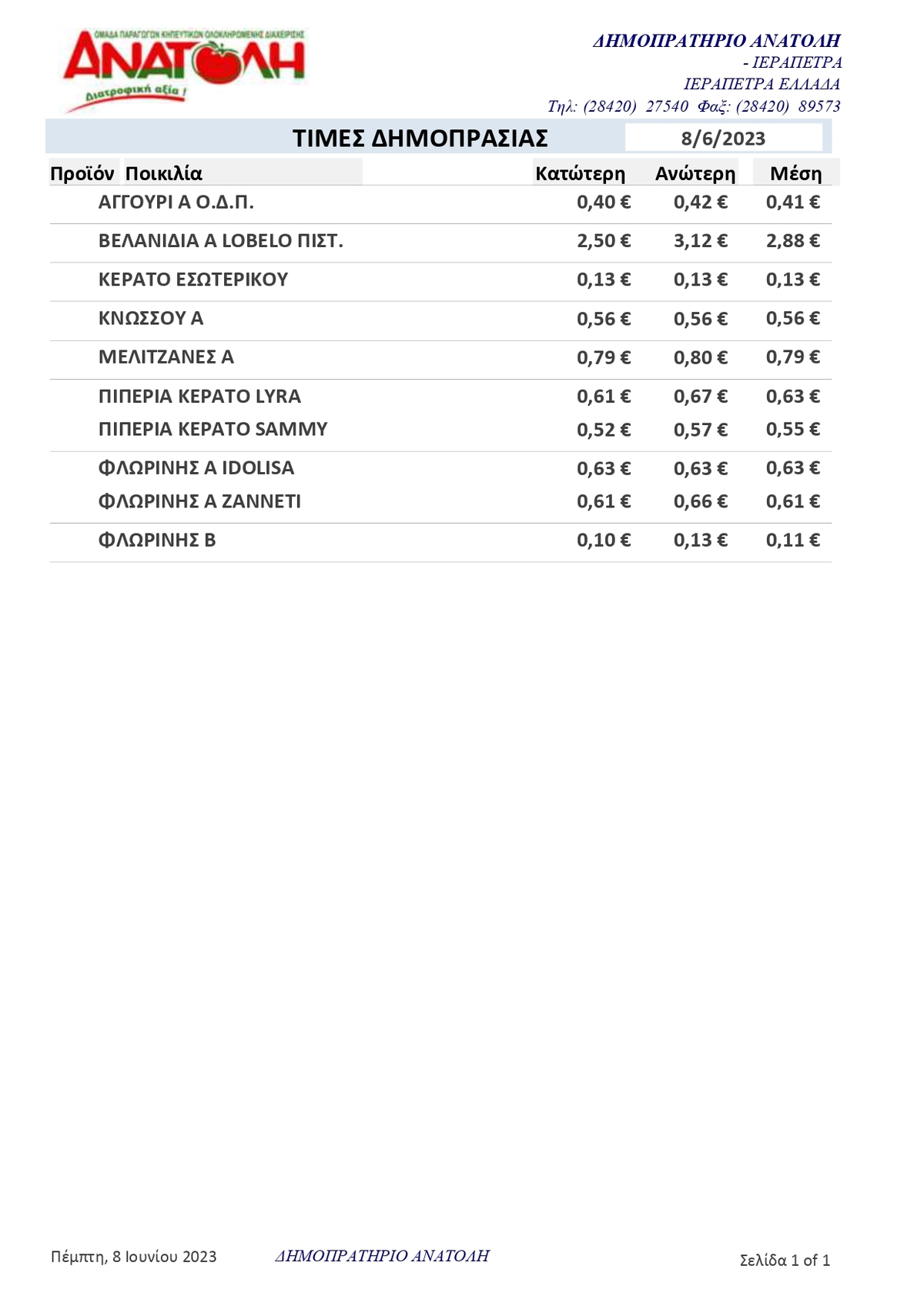 Α.Σ. ΑΝΑΤΟΛΗ | Τιμές Αγροτικών Προϊόντων 08-06-2023 ΤΙΜΕΣ 11:42 π.μ. - Πέμπτη 8 Ιουνίου 2023 11:06 π.μ. - Πέμ, 08/42/2023 ΙΕΡΑΠΕΤΡΑ, ΤΙΜΕΣ ΑΓΡΟΤΙΚΩΝ ΠΡΟΙΟΝΤΩΝ, ΔΗΜΟΠΡΑΣΙΑ, Α.Σ. ΑΝΑΤΟΛΗ Δείτε τις σημερινές τιμές του δημοπρατηρίου