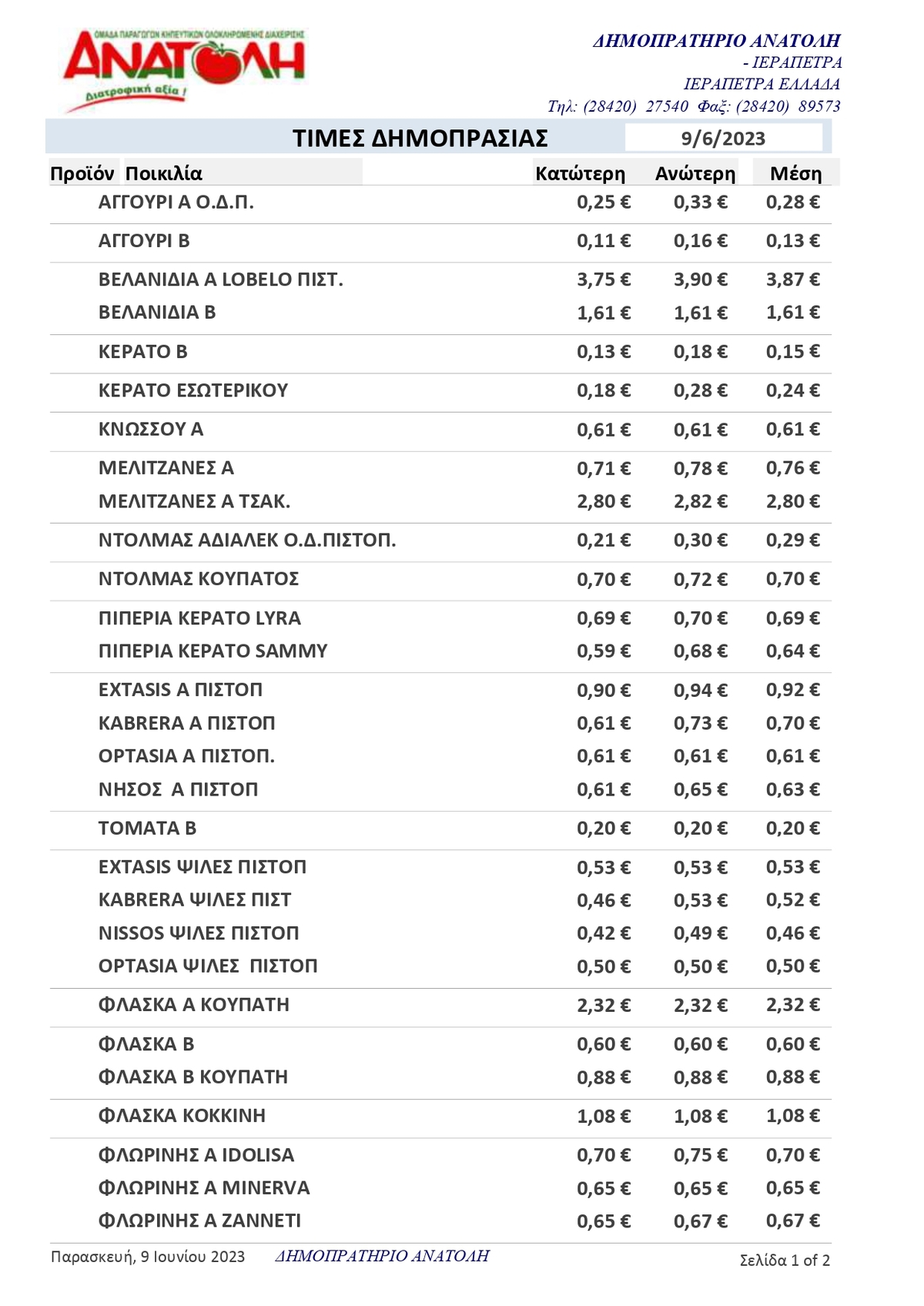Α.Σ. ΑΝΑΤΟΛΗ | Τιμές Αγροτικών Προϊόντων 09-06-2023 ΤΙΜΕΣ 12:18 μ.μ. - Παρασκευή 9 Ιουνίου 2023 12:06 μ.μ. - Παρ, 09/18/2023 ΙΕΡΑΠΕΤΡΑ, ΤΙΜΕΣ ΑΓΡΟΤΙΚΩΝ ΠΡΟΙΟΝΤΩΝ, ΔΗΜΟΠΡΑΣΙΑ, Α.Σ. ΑΝΑΤΟΛΗ Δείτε τις σημερινές τιμές του δημοπρατηρίου