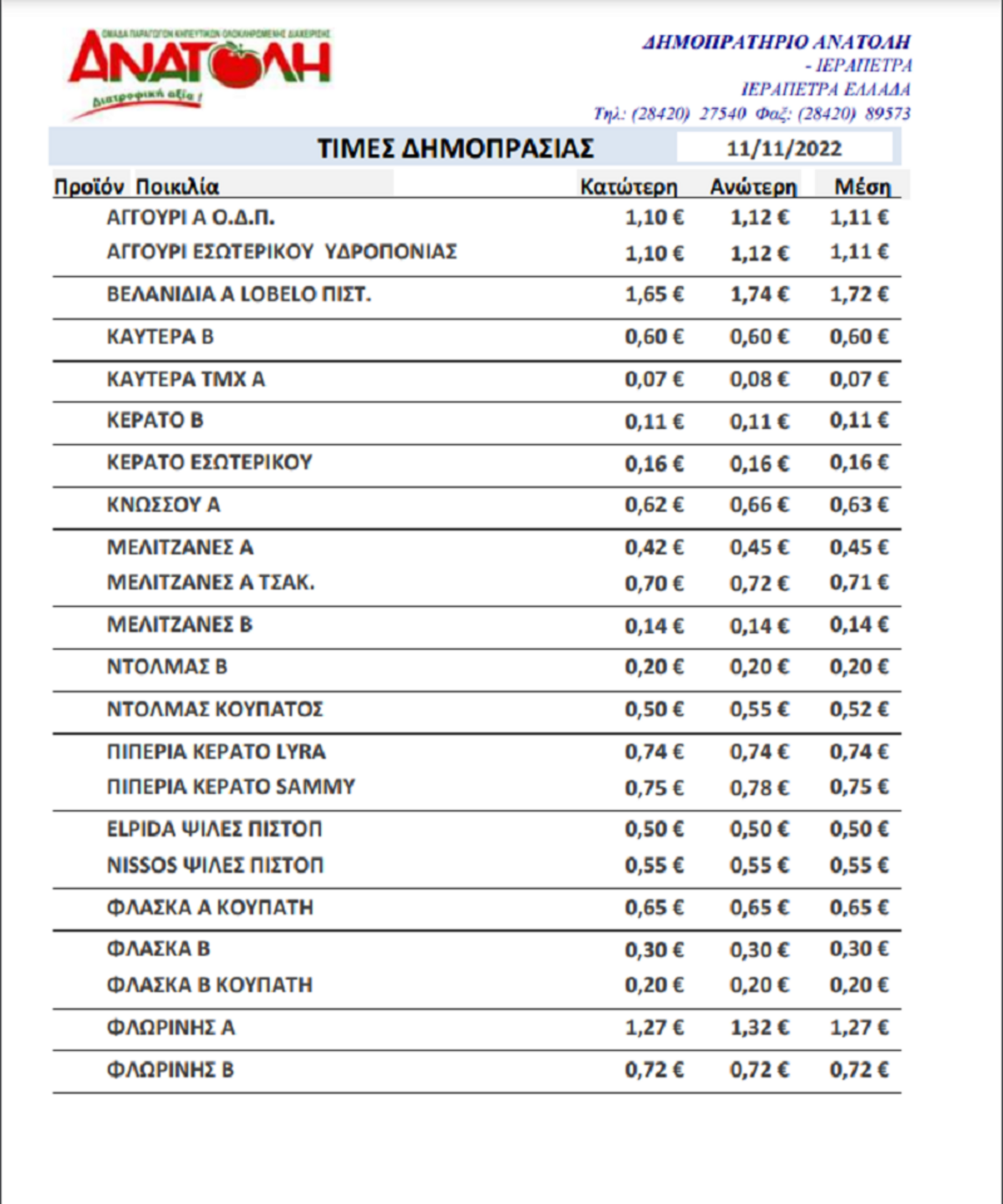 ΤΙΜΕΣ 08:46 π.μ. - 21/01/2026 Τιμές Αγροτικών Προϊόντων 21.01.2026 ΙΕΡΑΠΕΤΡΑ, ΤΙΜΕΣ ΑΓΡΟΤΙΚΩΝ ΠΡΟΙΟΝΤΩΝ , ΔΗΜΟΠΡΑΤΗΡΙΟ, ΚΗΠΕΥΤΙΚΑ Δείτε τις σημερινές τιμές του δημοπρατηρίου