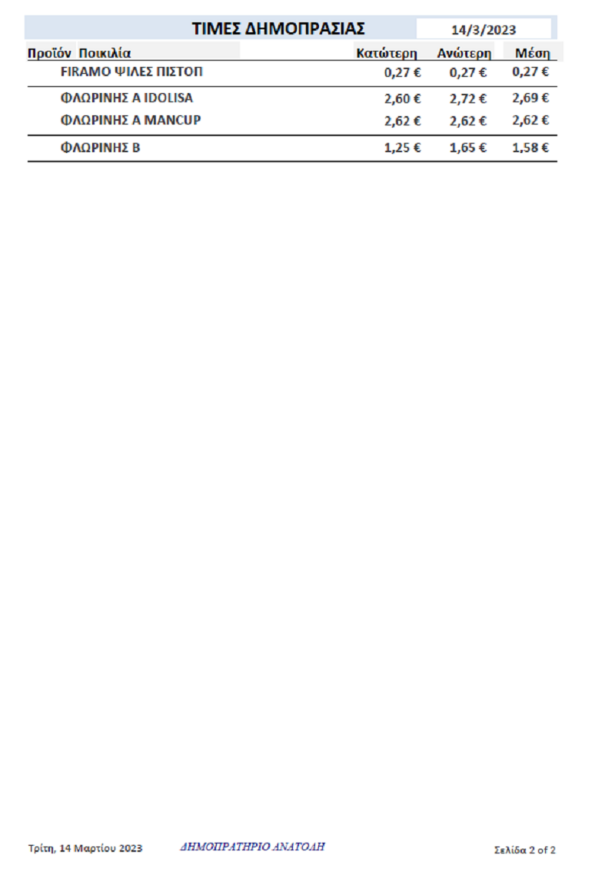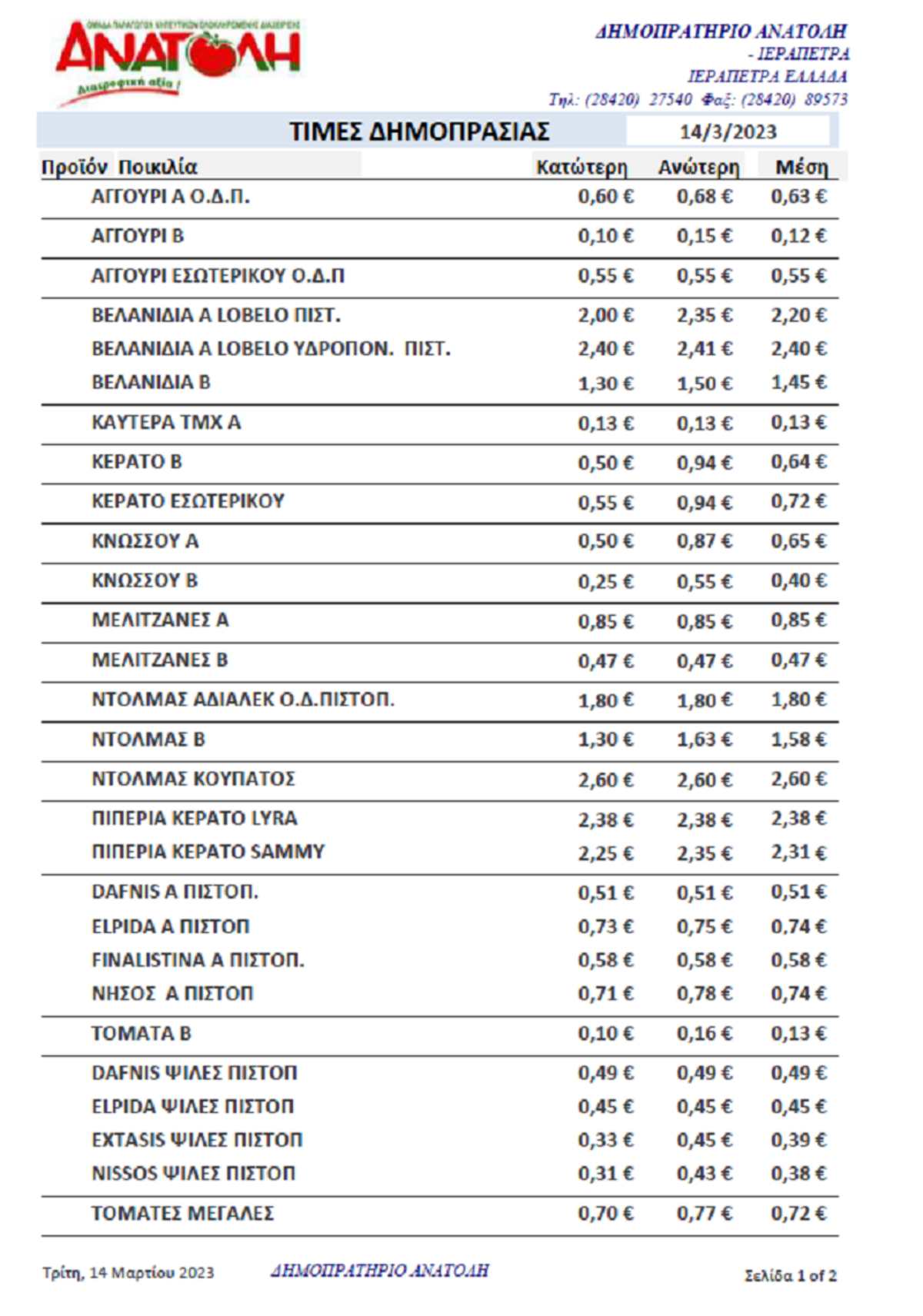 Α.Σ. ΑΝΑΤΟΛΗ | Τιμές Αγροτικών Προϊόντων 14-03-2023 ΤΙΜΕΣ 12:26 μ.μ. - Τρίτη 14 Μαρτίου 2023 12:03 μ.μ. - Τρί, 14/26/2023 ΙΕΡΑΠΕΤΡΑ, ΤΙΜΕΣ ΑΓΡΟΤΙΚΩΝ ΠΡΟΙΟΝΤΩΝ, ΔΗΜΟΠΡΑΣΙΑ, Α.Σ. ΑΝΑΤΟΛΗ Δείτε τις σημερινές τιμές του δημοπρατηρίου