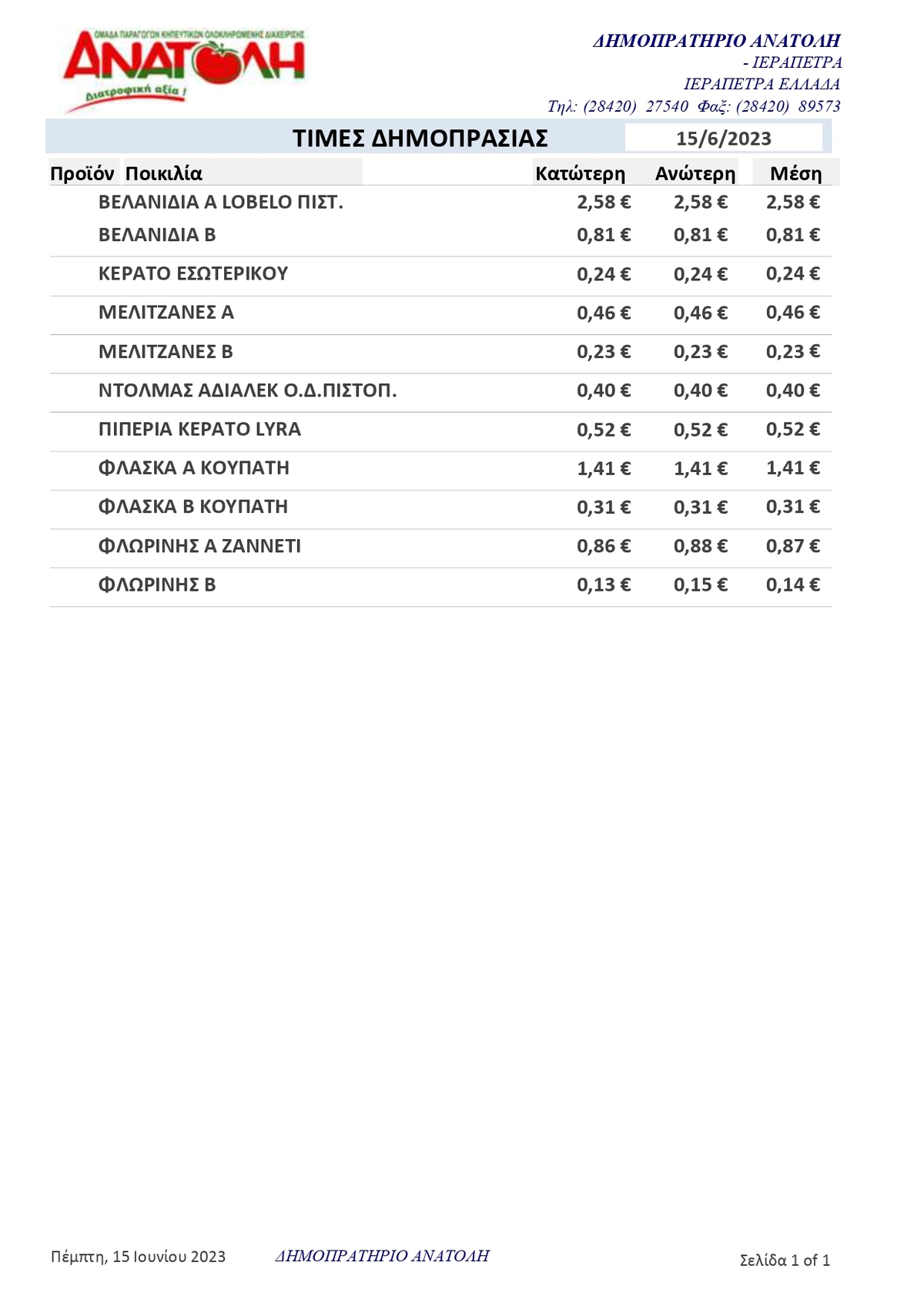 Α.Σ. ΑΝΑΤΟΛΗ | Τιμές Αγροτικών Προϊόντων 15-06-2023 ΤΙΜΕΣ 12:51 μ.μ. - Πέμπτη 15 Ιουνίου 2023 12:06 μ.μ. - Πέμ, 15/51/2023 ΙΕΡΑΠΕΤΡΑ, ΤΙΜΕΣ ΑΓΡΟΤΙΚΩΝ ΠΡΟΙΟΝΤΩΝ, ΔΗΜΟΠΡΑΣΙΑ, Α.Σ. ΑΝΑΤΟΛΗ Δείτε τις σημερινές τιμές του δημοπρατηρίου