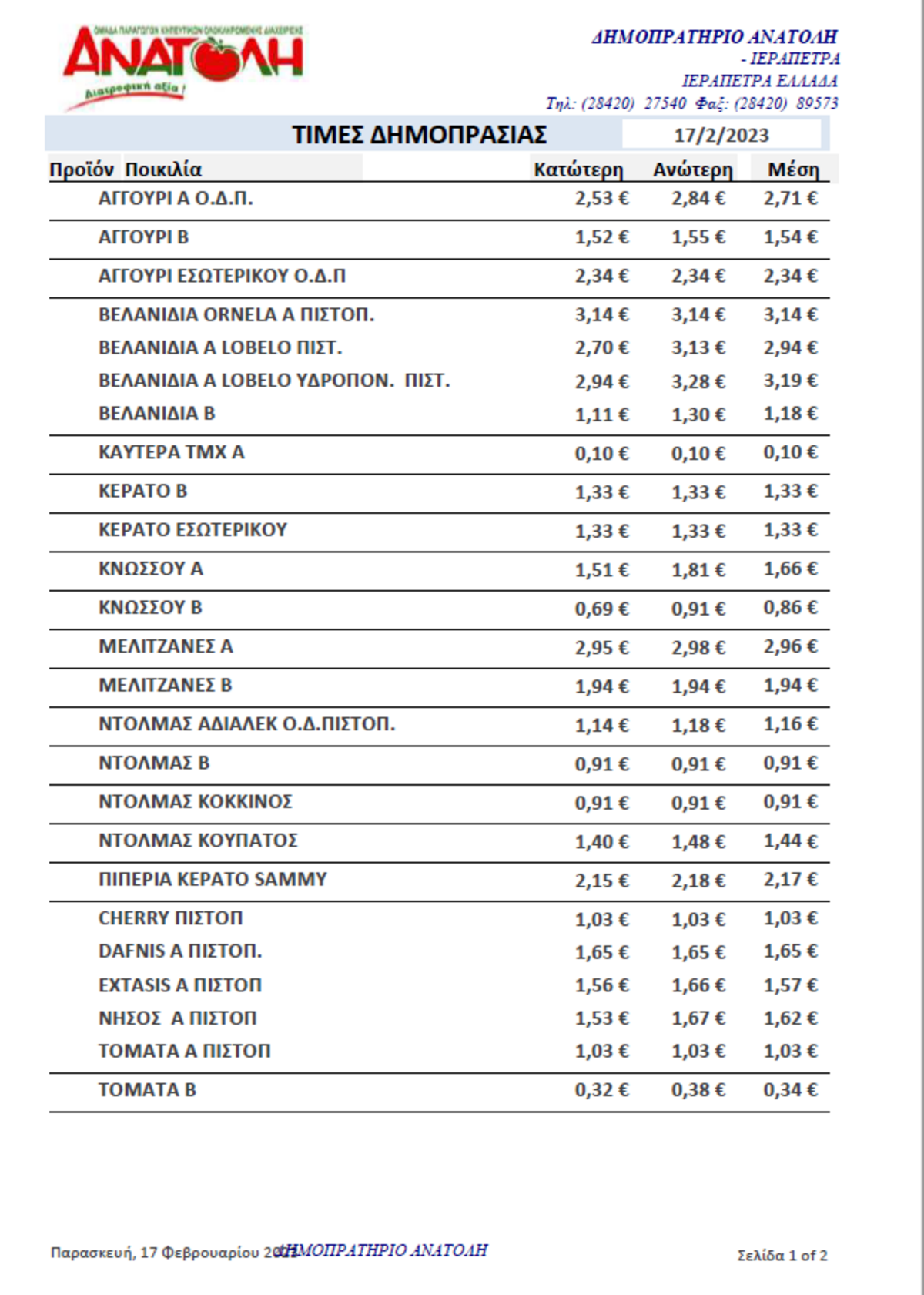 ΤΙΜΕΣ 03:37 μ.μ. - 17/01/2026 GOLDEN FARM |Τιμές Αγροτικών Προϊόντων 17.01.2026 ΙΕΡΑΠΕΤΡΑ, ΤΙΜΕΣ ΑΓΡΟΤΙΚΩΝ ΠΡΟΙΟΝΤΩΝ , ΔΗΜΟΠΡΑΤΗΡΙΟ, ΚΗΠΕΥΤΙΚΑ , GOLDEN FARM Δείτε τις σημερινές τιμές του δημοπρατηρίου