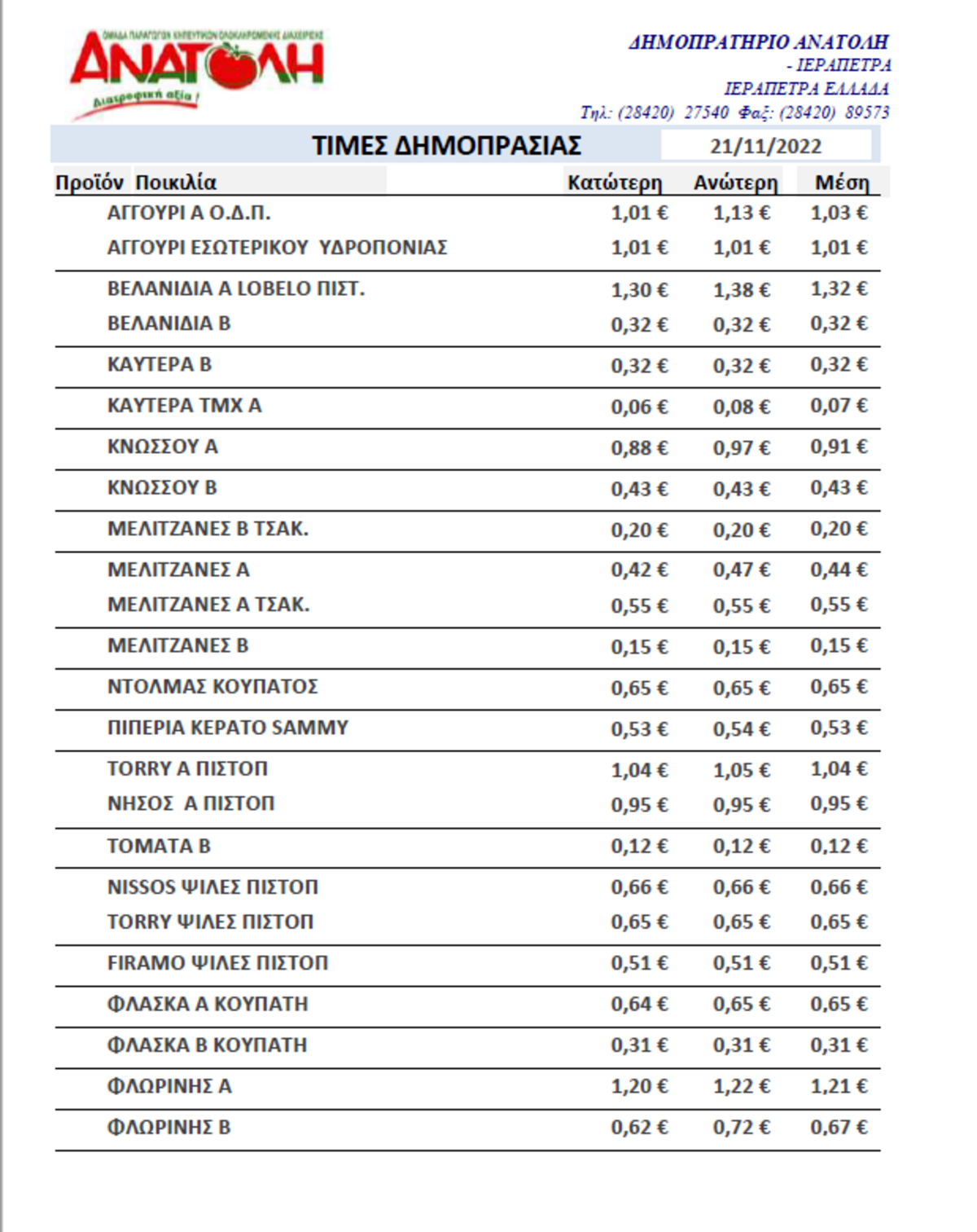 Α.Σ. ΑΝΑΤΟΛΗ | Τιμές Αγροτικών Προϊόντων 21-11-2022 AGROΝΕΑ ΤΙΜΕΣ 12:15 μ.μ. - Δευτέρα 21 Νοεμβρίου 2022 12:11 μ.μ. - Δευ, 21/15/2022 ΙΕΡΑΠΕΤΡΑ, ΤΙΜΕΣ ΑΓΡΟΤΙΚΩΝ ΠΡΟΙΟΝΤΩΝ, ΔΗΜΟΠΡΑΣΙΑ, Α.Σ. ΑΝΑΤΟΛΗ Δείτε τις σημερινές τιμές του δημοπρατηρίου
