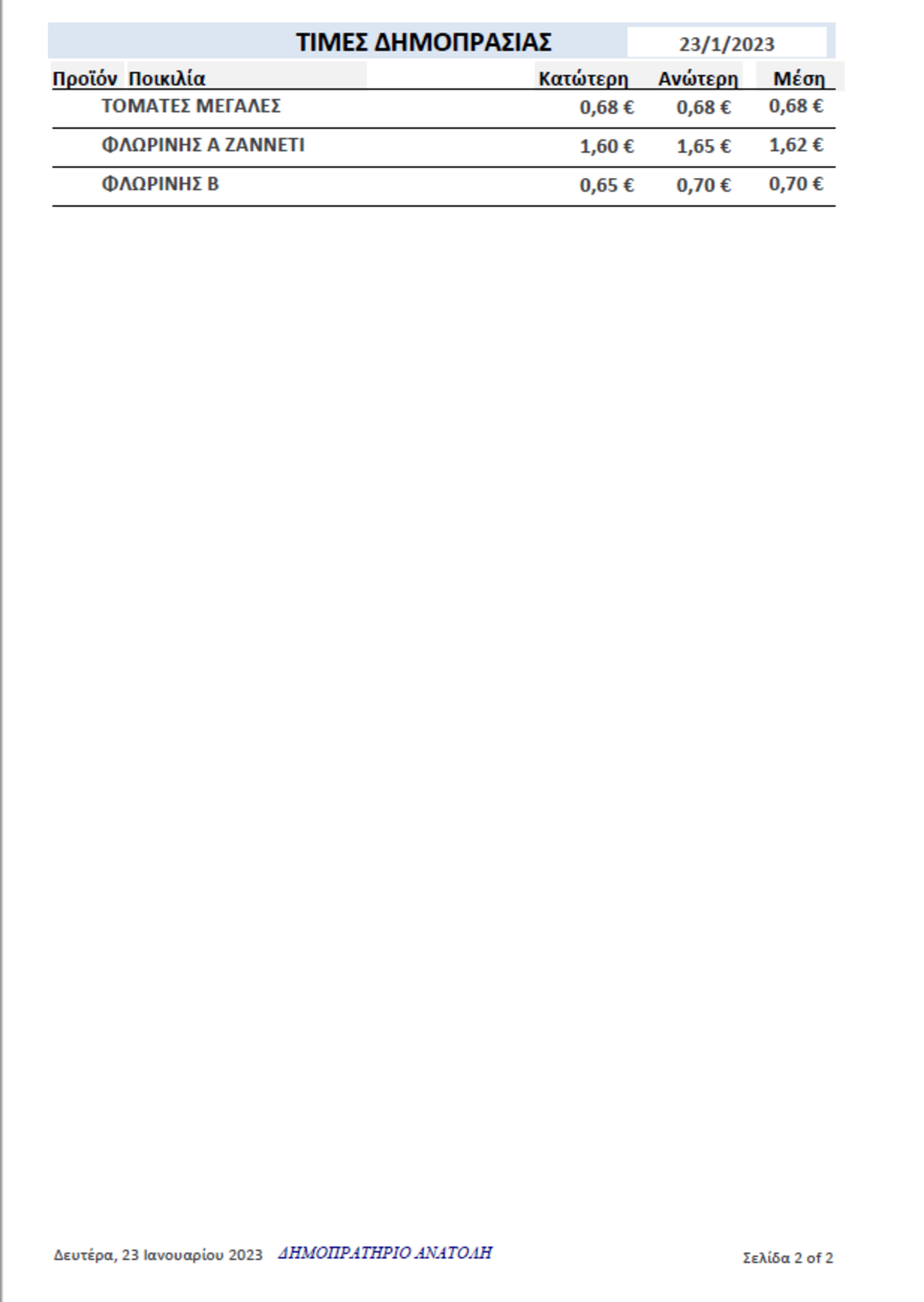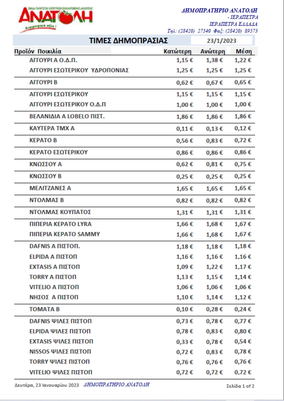 Α.Σ. ΑΝΑΤΟΛΗ | Τιμές Αγροτικών Προϊόντων 23-01-2023 AGROΝΕΑ ΤΙΜΕΣ 12:37 μ.μ. - Δευτέρα 23 Ιανουαρίου 2023 12:01 μ.μ. - Δευ, 23/37/2023 ΙΕΡΑΠΕΤΡΑ, ΤΙΜΕΣ ΑΓΡΟΤΙΚΩΝ ΠΡΟΙΟΝΤΩΝ, ΔΗΜΟΠΡΑΣΙΑ, Α.Σ. ΑΝΑΤΟΛΗ Δείτε τις σημερινές τιμές του δημοπρατηρίου