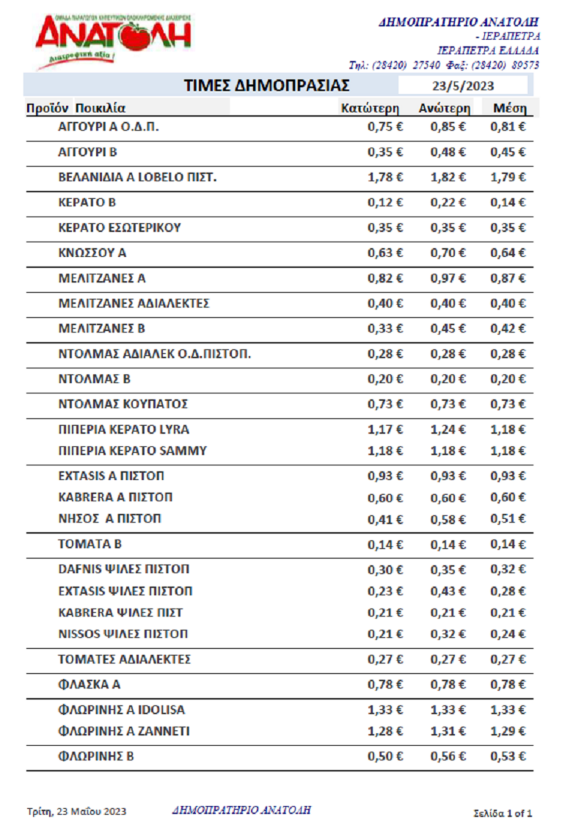 Α.Σ. ΑΝΑΤΟΛΗ | Τιμές Αγροτικών Προϊόντων 23-05-2023 ΤΙΜΕΣ 12:12 μ.μ. - Τρίτη 23 Μαΐου 2023 12:05 μ.μ. - Τρί, 23/12/2023 ΙΕΡΑΠΕΤΡΑ, ΤΙΜΕΣ ΑΓΡΟΤΙΚΩΝ ΠΡΟΙΟΝΤΩΝ, ΔΗΜΟΠΡΑΣΙΑ, Α.Σ. ΑΝΑΤΟΛΗ Δείτε τις σημερινές τιμές του δημοπρατηρίου