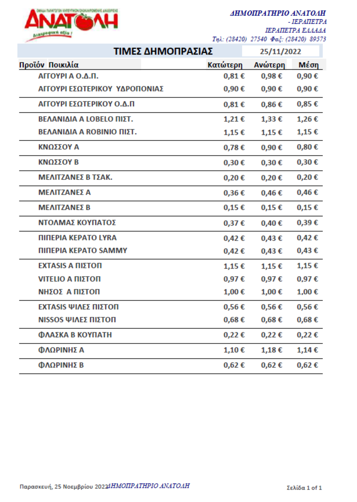 Α.Σ. ΑΝΑΤΟΛΗ | Τιμές Αγροτικών Προϊόντων 25-11-2022 AGROΝΕΑ ΤΙΜΕΣ 5:09 μ.μ. - Παρασκευή 25 Νοεμβρίου 2022 05:11 μ.μ. - Παρ, 25/09/2022 ΙΕΡΑΠΕΤΡΑ, ΤΙΜΕΣ ΑΓΡΟΤΙΚΩΝ ΠΡΟΙΟΝΤΩΝ, ΔΗΜΟΠΡΑΣΙΑ, Α.Σ. ΑΝΑΤΟΛΗ Δείτε τις σημερινές τιμές του δημοπρατηρίου