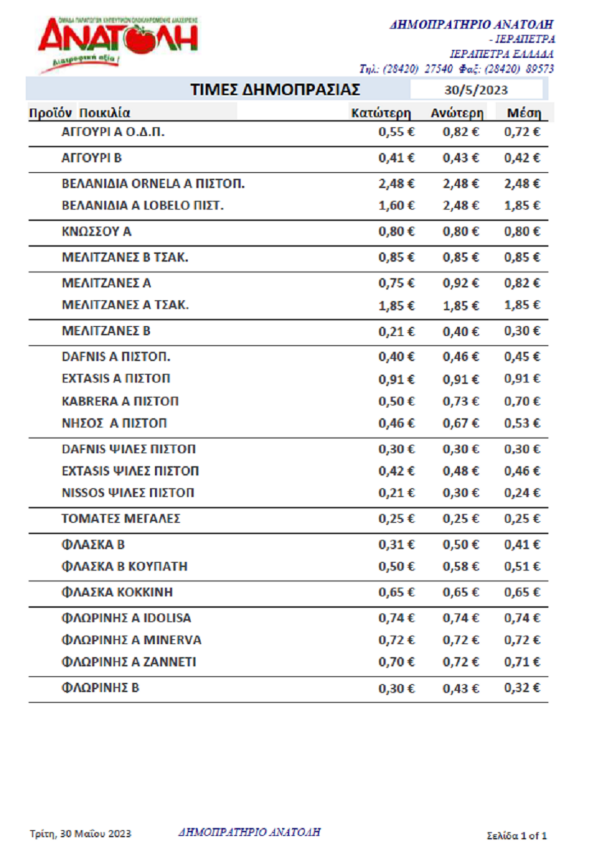 Α.Σ. ΑΝΑΤΟΛΗ | Τιμές Αγροτικών Προϊόντων 30-05-2023 ΤΙΜΕΣ 12:02 μ.μ. - Τρίτη 30 Μαΐου 2023 12:05 μ.μ. - Τρί, 30/02/2023 ΙΕΡΑΠΕΤΡΑ, ΤΙΜΕΣ ΑΓΡΟΤΙΚΩΝ ΠΡΟΙΟΝΤΩΝ, ΔΗΜΟΠΡΑΣΙΑ, Α.Σ. ΑΝΑΤΟΛΗ Δείτε τις σημερινές τιμές του δημοπρατηρίου