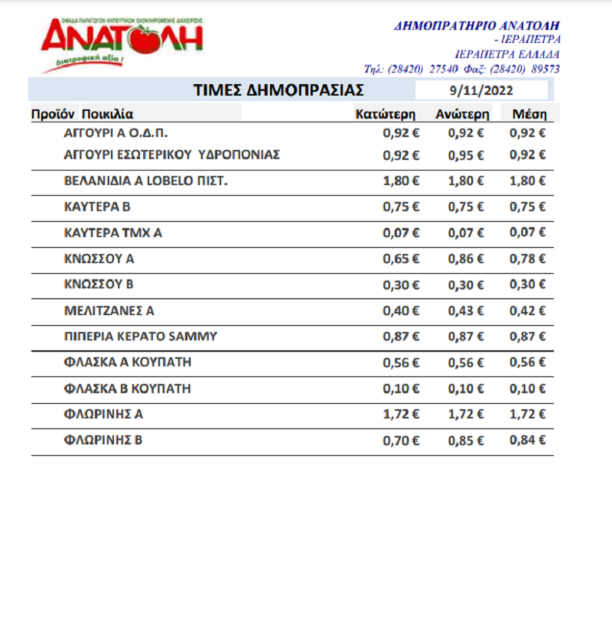 Α.Σ. ΑΝΑΤΟΛΗ | Τιμές Αγροτικών Προϊόντων 9-11-2022 AGROΝΕΑ ΤΙΜΕΣ 11:44 π.μ. - Τετάρτη 9 Νοεμβρίου 2022 11:11 π.μ. - Τετ, 09/44/2022 ΙΕΡΑΠΕΤΡΑ, ΤΙΜΕΣ ΑΓΡΟΤΙΚΩΝ ΠΡΟΙΟΝΤΩΝ, Α.Σ. ΑΝΑΤΟΛΗ Δείτε τις σημερινές τιμές του δημοπρατηρίου