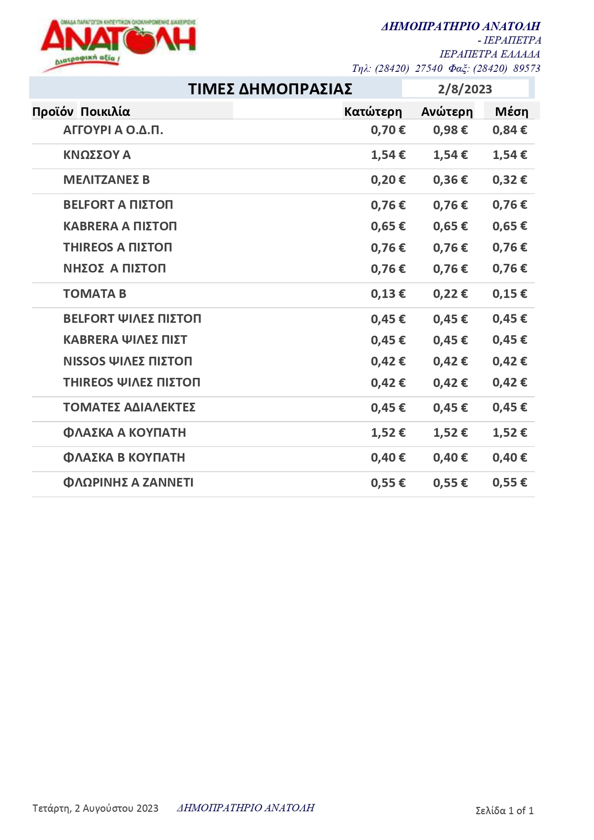 Α.Σ. ΑΝΑΤΟΛΗ - Τιμές Αγροτικών Προϊόντων 2-8-2023 ΛΑΣΙΘΙ ΙΕΡΑΠΕΤΡΑ 11:36 π.μ. - Τετάρτη 2 Αυγούστου 2023 11:08 π.μ. - Τετ, 02/36/2023 ΤΙΜΕΣ ΑΓΡΟΤΙΚΩΝ ΠΡΟΙΟΝΤΩΝ, ΔΗΜΟΠΡΑΤΗΡΙΟ, ΑΝΑΤΟΛΗ Οι τιμές του δημοπρατηρίου