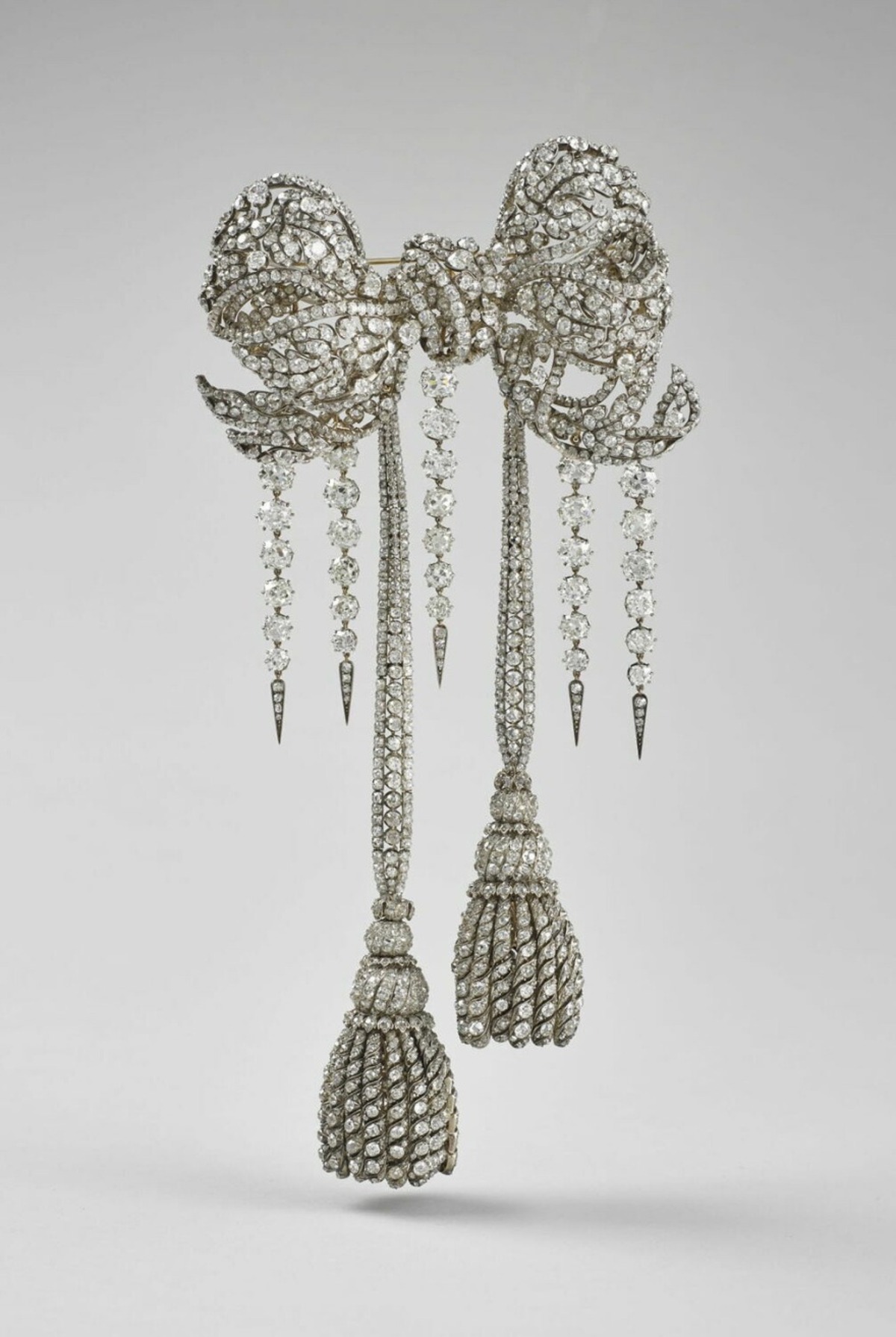 Η συγκεκριμένη καρφίτσα φιόγκος έχει 2.634 διαμάντια και αγοράστηκε από το μουσείο του Λούβρου για 6,72 εκατομμύρια ευρώ. Πριν από την απόκτησή του το 2008, βρισκόταν σε ιδιωτική συλλογή στις ΗΠΑ.