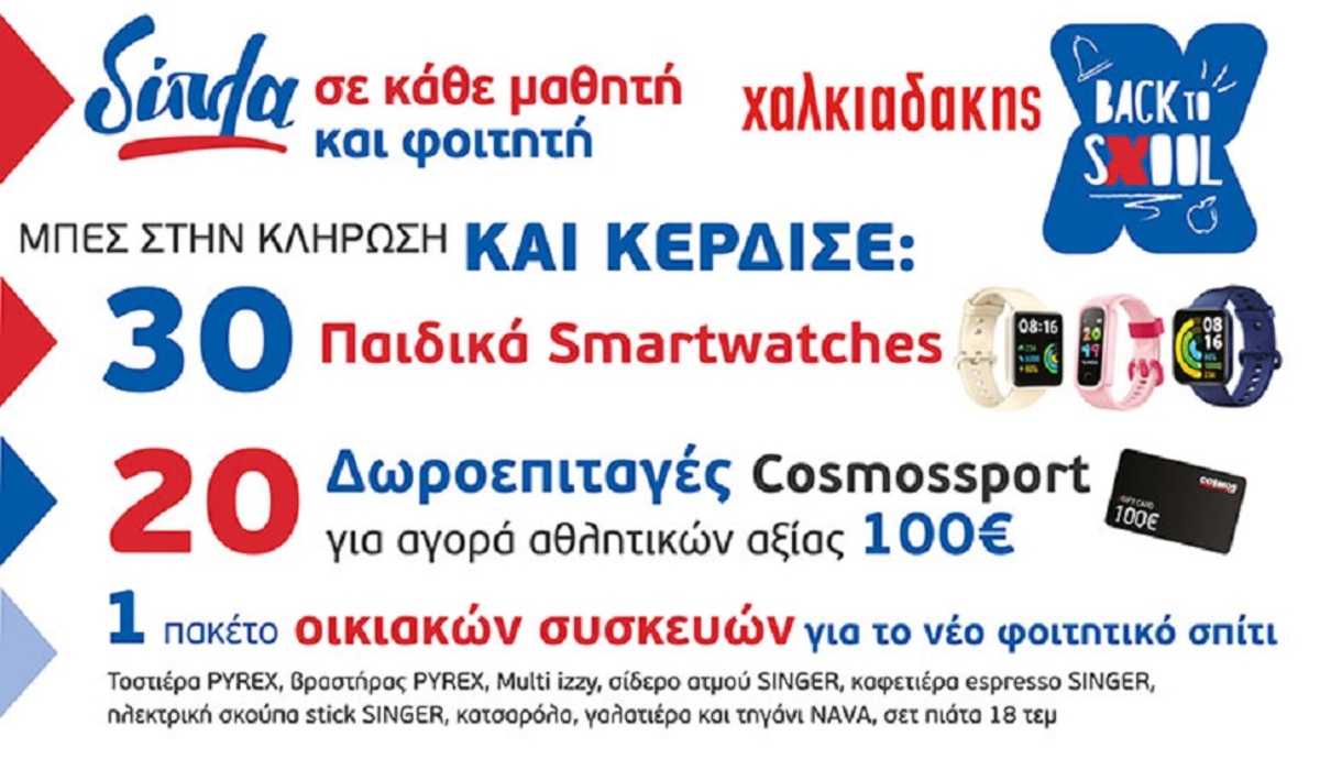 30 παιδικά smartwatches για τους μικρούς μας φίλους, 20 δωροεπιταγές Cosmossport αξίας 100€ η κάθε μια και 1 πακέτο οικιακών συσκευών για το νέο φοιτητικό σας σπίτι