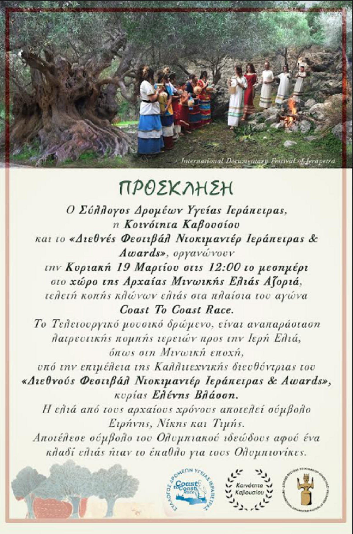 Ο σύλλογος δρομέων υγείας Ιεράπετρας και η κοινότητα Καβουσίου και το Διεθνές Φεστιβάλ Ντοκιμαντέρ Ιεράπετρας & awards διοργανώνουν την Κυριακή 19 Μαρτίου στις 12 το μεσημέρι στο χώρo της Αρχαίας Ελιάς Καβουσίου, τελετή κοπής κλώνων ελιάς στο πλαίσιο του αγώνα Coast to Coast Race.