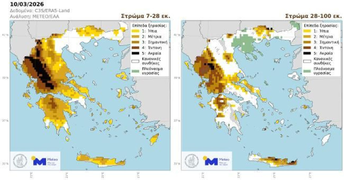 -Το μεγαλύτερο μέρος της Κρήτης παραμένει σε συνθήκες ήπιας έως έντονης σχετικής ξηρασίας και στα δύο στρώματα υπεδάφους.