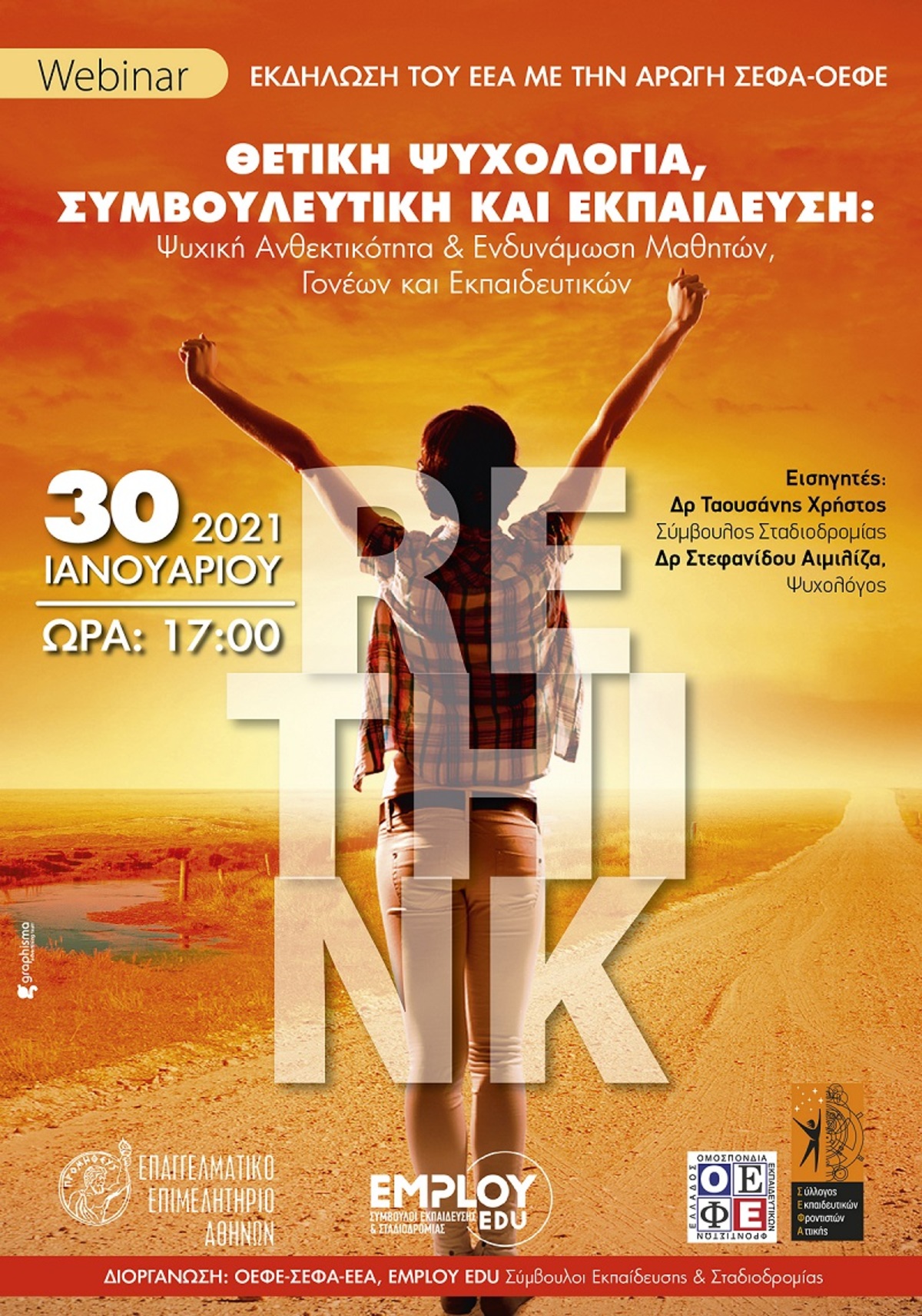 Η Ομοσπονδία Εκπαιδευτικών Φροντιστών Ελλάδος-ΟΕΦΕ και ο Σύλλογος Εκπαιδευτικών Φροντιστών Αττικής-ΣΕΦΑ με την αρωγή του Επαγγελματικού Επιμελητηρίου Αθηνών-ΕΕΑ διοργανώνει τo Σάββατο 30 Ιανουαρίου 2021 και ώρα 5μ.μ. διαδικτυακή ενημερωτική ημερίδα με θέμα «Θετική Ψυχολογία, Συμβουλευτική και Εκπαίδευση: Ψυχική Ανθεκτικότητα και Ενδυνάμωση Μαθητών, Γονέων και Εκπαιδευτικών». Η ημερίδα απευθύνεται σε μαθητές, γονείς και εκπαιδευτικούς.