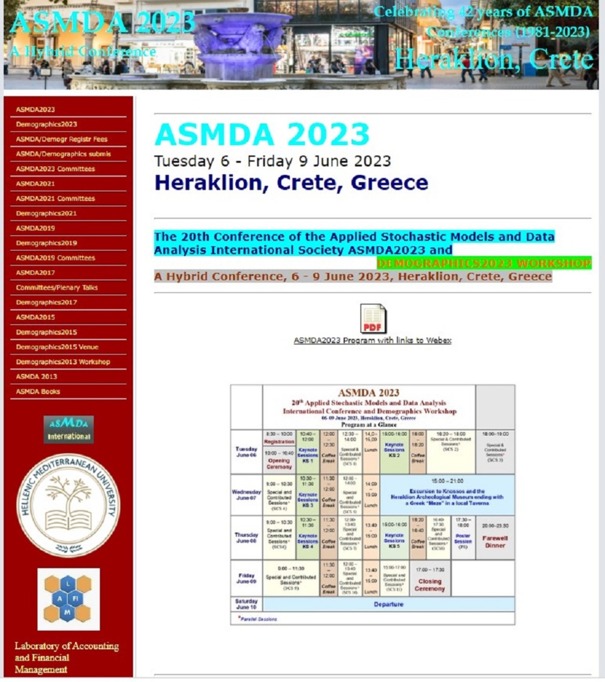 Το 20ο Διεθνές Επιστημονικό Συνέδριο “Applied Stochastic Models and Data Analysis – ASMDA” θα φιλοξενηθεί στο διάστημα 6-9 Ιουνίου 2023 στο Ηράκλειο Κρήτης. Το Συνέδριο συν-διοργανώνεται από το Τμήμα Λογιστικής και Χρηματοοικονομικής και το Εργαστήριο Λογιστικής και Χρηματοοικονομικής Διοίκησης (LAFIM), του Ελληνικού Μεσογειακού Πανεπιστημίου (ΕΛΜΕΠΑ), και την ASMDA International Society. Οι εργασίες του Συνεδρίου θα λάβουν χώρα στο κτίριο της Σχολής Επιστημών Υγείας του ΕΛΜΕΠΑ στο Ηράκλειο.