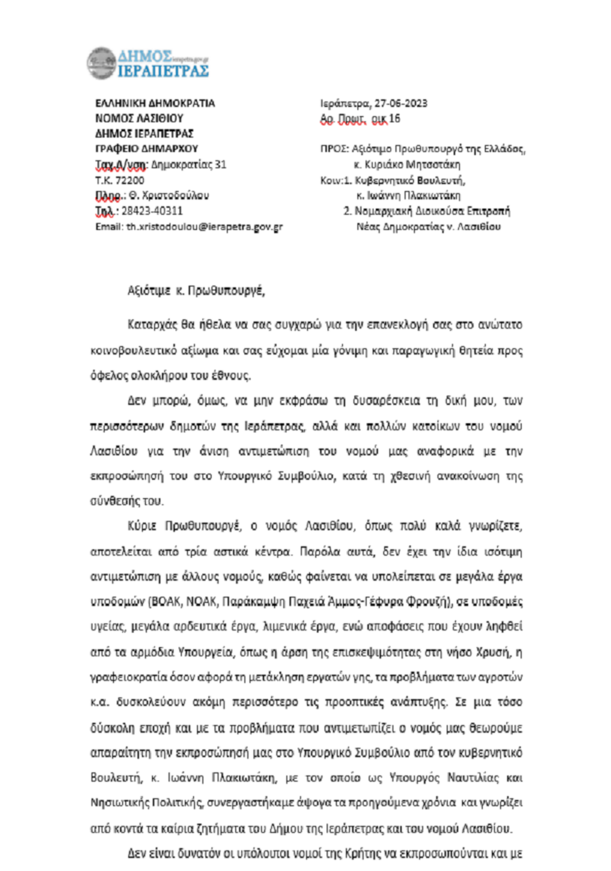 Δυσαρέσκεια Δημάρχου Ιεράπετρας για την μη υπουργοποίηση Πλακιωτάκη ΛΑΣΙΘΙ ΙΕΡΑΠΕΤΡΑ 9:41 π.μ. - Τετάρτη 28 Ιουνίου 2023 09:06 π.μ. - Τετ, 28/41/2023 ΠΛΑΚΙΩΤΑΚΗΣ, ΥΠΟΥΡΓΕΙΟ , ΕΠΙΣΤΟΛΗ , ΚΑΛΑΝΤΖΑΚΗΣ, ΜΗΤΣΟΤΑΚΗΣ Η επιστολή του Θ. Καλαντζάκη στον Πρωθυπουργό