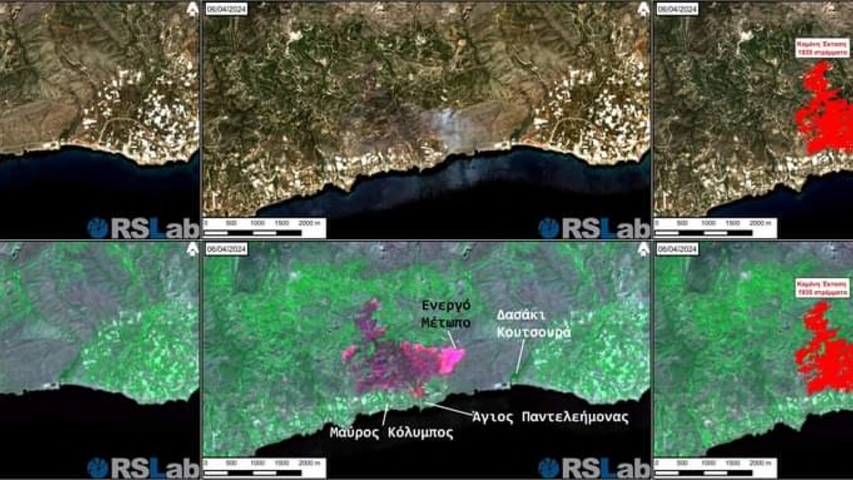 Στάχτη έχουν γίνει 2.000 στρέμματα στο Μαύρο Κόλυμπο στην Ιεράπετρα, όπως καταγράφονται απ' το Εργαστήριο Τηλεπισκόπησης (https://rslab.gr/) του ΙΤΕ (Ίδρυμα Τεχνολογίας και Έρευνας), μέχρι τις πρώτες μεσημεριανές ώρες του Σαββάτου, 06/04/2024, με τη χρήση δορυφορικών δεδομένων Sentinel-2.
