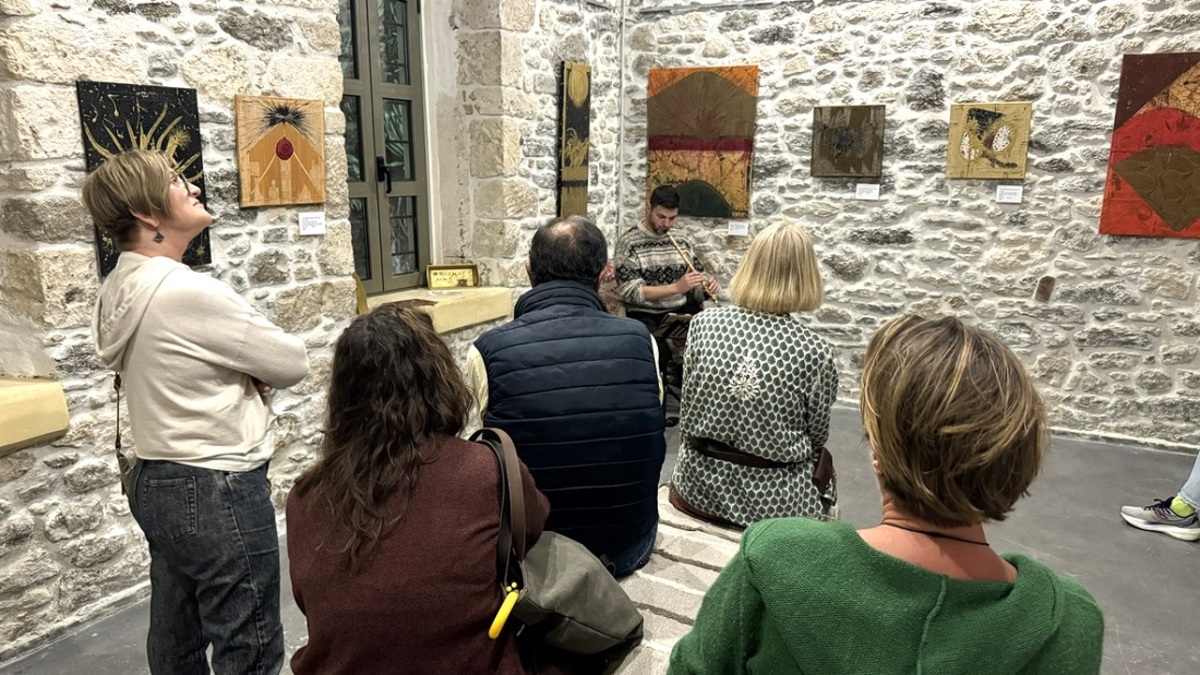 Στον ιδιαίτερο χώρο της έκθεσης, δεκάδες έργα αφηρημένης τέχνης, εμπνευσμένα από το κρητικό τοπίο, την παράδοση και τη μεσογειακή κουλτούρα, συνδυάστηκαν αρμονικά με τα δομικά χαρακτηριστικά του κτιρίου, όπως οι ξύλινες δοκοί και οι πέτρινοι τοίχοι. Οι επισκέπτες είχαν την ευκαιρία να απολαύσουν τις ζωγραφικές δημιουργίες, συνοδευόμενοι από τους μελωδικούς ήχους του φλάουτου του συντοπίτη καλλιτέχνη, Νίκου Παραουλάκη. Βυζαντινές μελωδίες και αυθεντικοί κρητικοί ρυθμοί συνόδευαν τους επισκέπτες καθώς απολάμβαναν ένα ποτήρι κρασί και γευστικά ορεκτικά, περιηγούμενοι στους χώρους της έκθεσης.