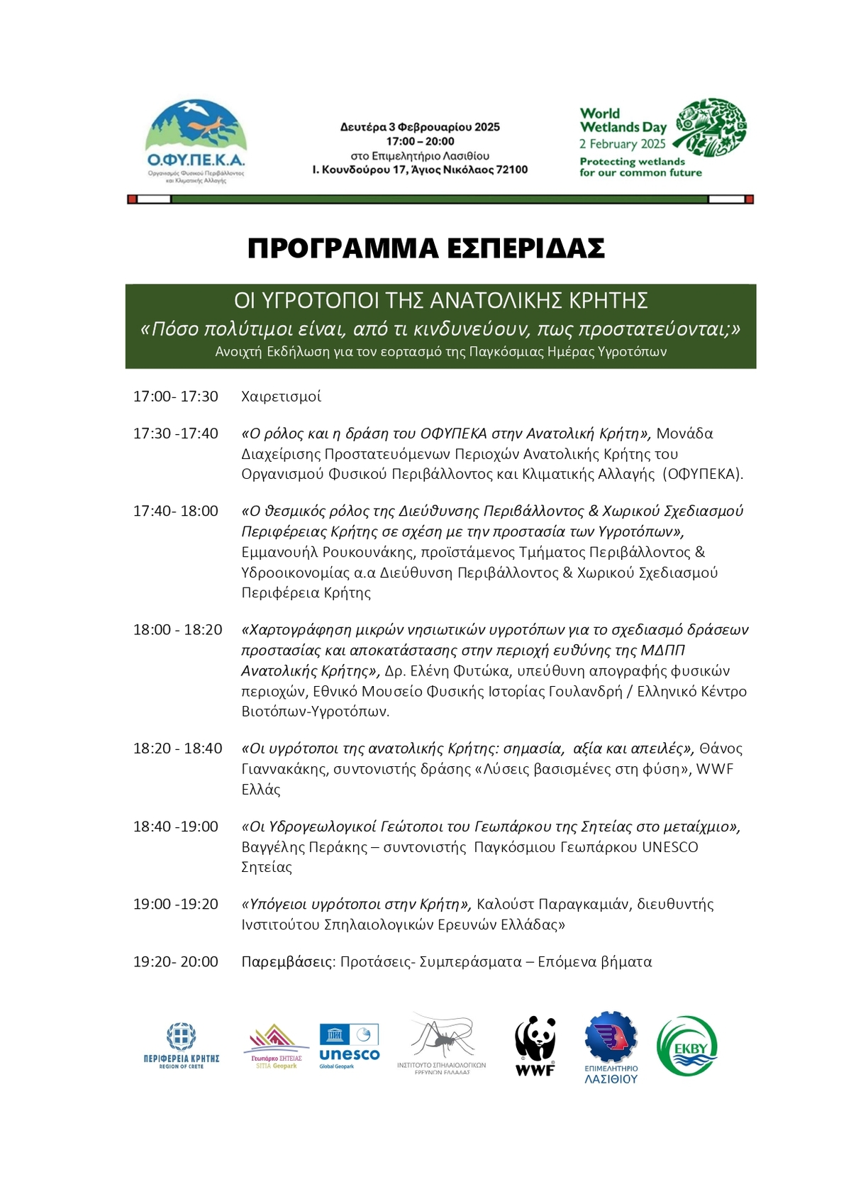 ΕΣΠΕΡΙΔΑ ΓΙΑ ΤΟΥΣ ΥΓΡΟΤΟΠΟΥΣ ΤΗΣ ΑΝΑΤΟΛΙΚΗΣ ΚΡΗΤΗΣ Άγιος Νικόλαος, Δευτέρα 3 Φεβρουαρίου 2025, 17:00-20:00