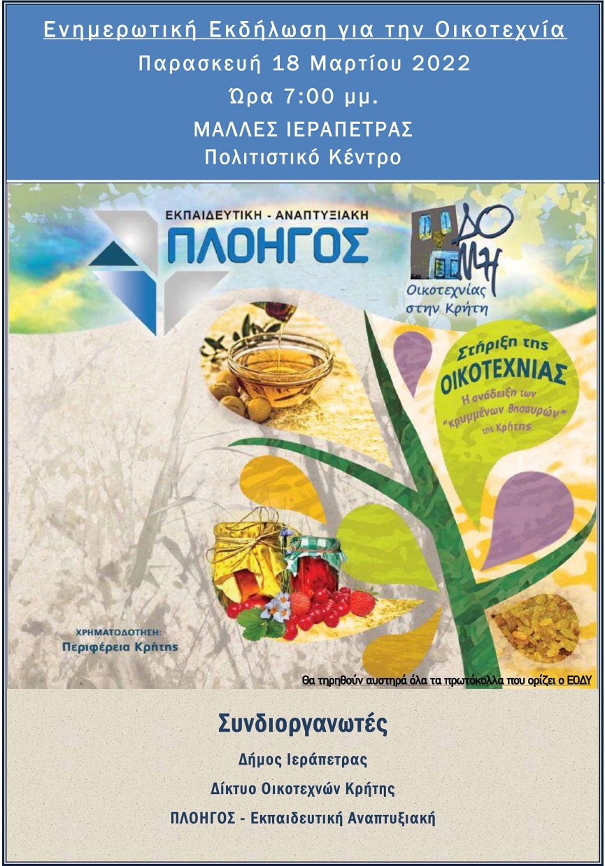 Η Εκπαιδευτική Αναπτυξιακή ΠΛΟΗΓΟΣ, ο Δήμος Ιεράπετρας και το Δίκτυο Οικοτεχνών Κρήτης συνδιοργανώνουν Εκδήλωση για την Οικοτεχνία, την Παρασκευή 18 Μαρτίου 2022 και ώρα 7:00 μμ, στην αίθουσα του Πολιτιστικού Κέντρου στις Μάλλες.