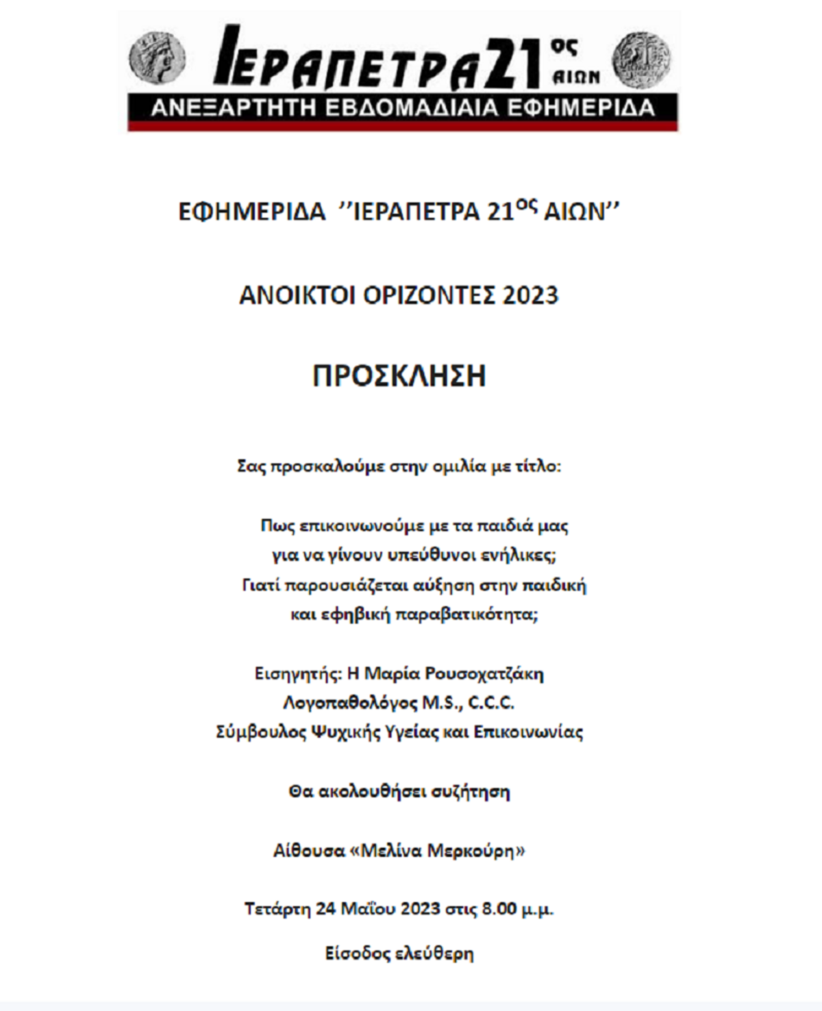 Εκδήλωση για την παιδική και εφηβική παραβατικότητα σήμερα Τετάρτη στην Ιεράπετρα ΛΑΣΙΘΙ ΙΕΡΑΠΕΤΡΑ 9:33 π.μ. - Τετάρτη 24 Μαΐου 2023 09:05 π.μ. - Τετ, 24/33/2023 ΠΡΟΣΚΛΗΣΗ , ΜΕΛΙΝΑ ΜΕΡΚΟΥΡΗ, ΙΕΡΑΠΕΤΡΑ 21ΟΣ ΑΙΩΝΑΣ Θα μιλήσει η Μαρία Ρουσοχατζάκη, Λογοπαθολόγος M.S., C.C.C. Σύμβουλος Ψυχικής Υγείας και Επικοινωνίας