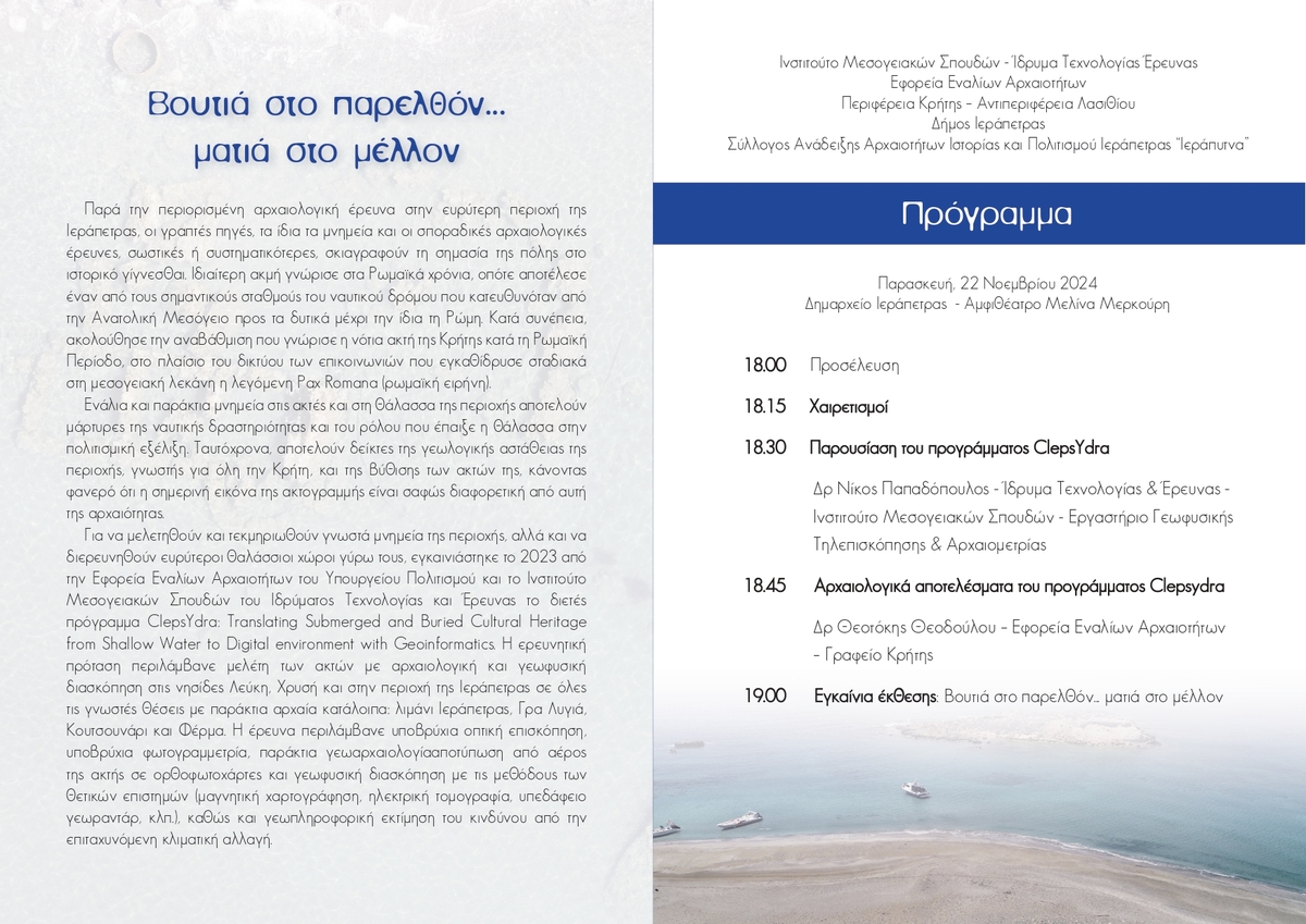 Μελίνα Μερκούρη στην Ιεράπετρα θα γίνει εκδήλωση που διοργανώνει ο Σύλλογος Αρχαιοτήτων- Ιεράπυτνα σε συνεργασία με τον Δήμο Ιεράπετρας, την Αντιπεριφέρεια Λασιθίου το Ινστιτούτο Μεσογειακών Ερευνών του ΙΤΕ Κρήτης και την Εφορεία Ενάλιων Αρχαιοτήτων με θέμα τα αποτελέσματα του διετούς προγράμματος