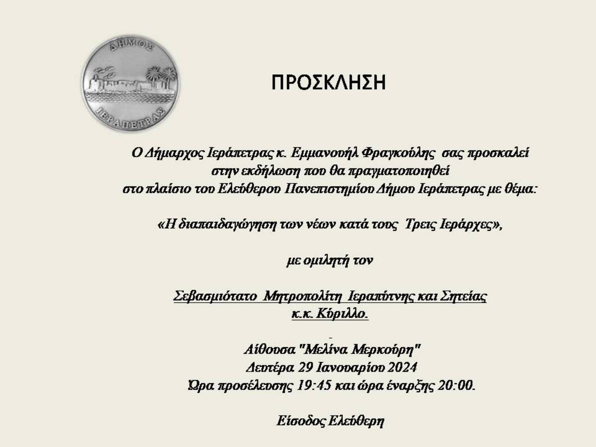 «Η διαπαιδαγώγηση των νέων κατά τους Τρεις Ιεράρχες», με ομιλητή τον Σεβασμιότατο Μητροπολίτη Ιεραπύτνης και Σητείας κ.κ. Κύριλλο.
