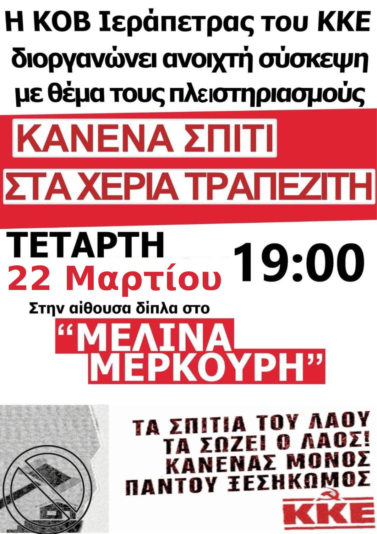 Σύσκεψη με θέμα τους πλειστηριασμούς και τίτλο: «Τα σπίτια τα λαού τα σώζει ο λαός! Κανένας μόνος! Παντού ξεσηκωμός!», διοργανώνει η ΚΟΒ Ιεράπετρας, του ΚΚΕ, την Τετάρτη 22 Μαρτίου στις 19:00, στην αίθουσα δίπλα στο Μελίνα Μερκούρη.