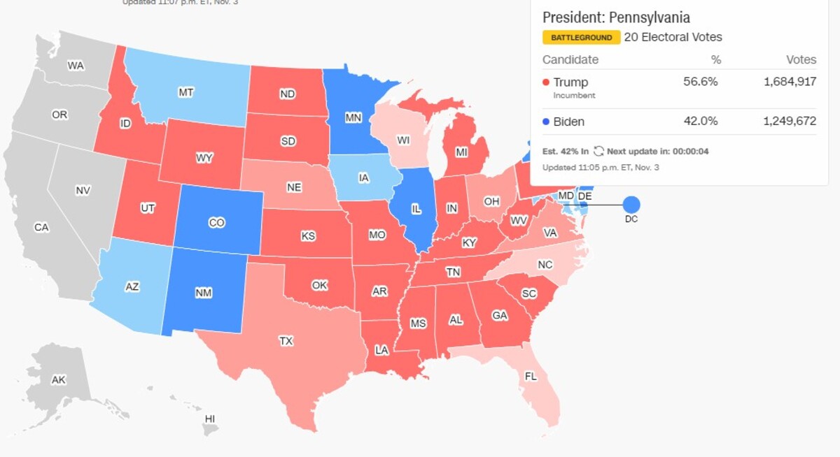Αν και ακόμα είναι πολύ νωρίς για οποιοδήποτε αποτέλεσμα, φαίνεται πως ο Ντόναλντ Τραμπ έχει καταφέρει να κερδίσει ένα μικρό προβάδισμα, αφού φαίνεται να προηγείται σε πολλές από τις πολιτείες «κλειδιά». Αντιθέτως, όμως, ο Τζο Μπάιντεν, φαίνεται να συγκεντρώνει -προς το παρόν- περισσότερους εκλέκτορες.