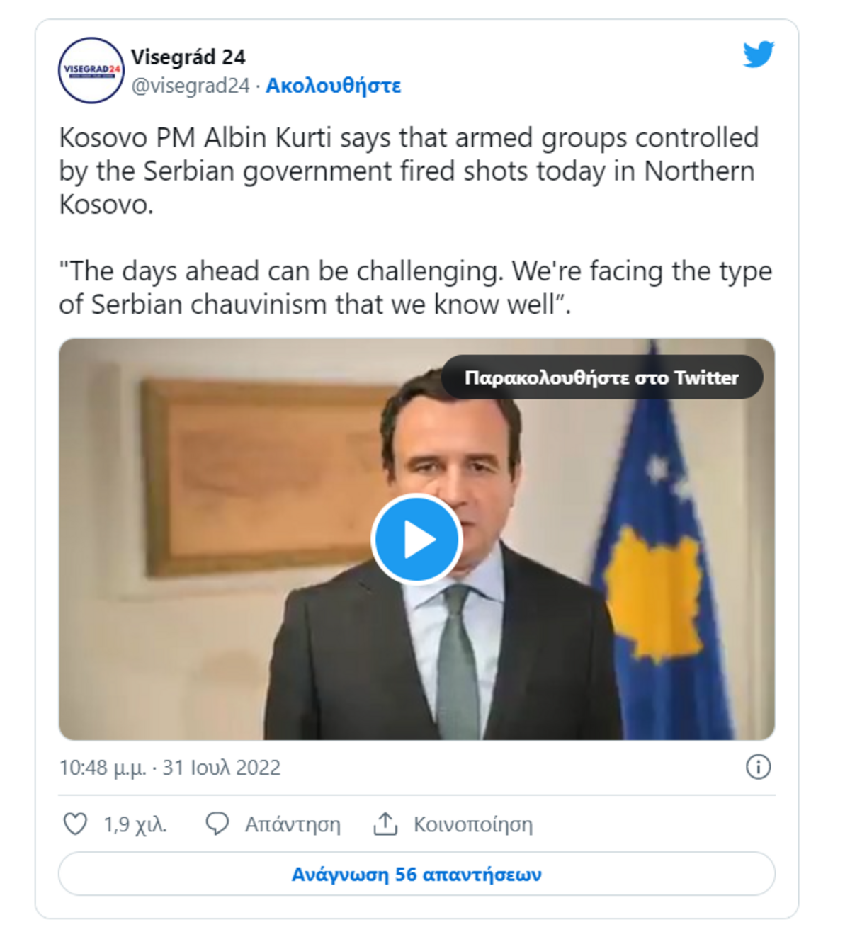 Στον αντίποδα, ευχαριστίες προς τον Αμερικανό Πρεσβευτή στο Κόσοβο, Jeff Hovenier απηύθυνε η Κυβέρνηση του Κοσόβου στο κείμενο του επίσημου ανακοινωθέντος, με το οποίο έκανε γνωστή την απόφασή της για παράταση εφαρμογής των αποφάσεών της για τις πινακίδες μέχρι την 1η Σεπτεμβρίου. Παράταση, την οποία πρότεινε ο κ. Hovenier κατά τη χθεσινή του συνάντηση με τον Πρωθυπουργό του Κοσόβου, Αλμπίν Κούρτι και άλλους κυβερνητικούς αξιωματούχους, αλλά και με παρόντες Αμερικανούς και ευρωπαίους διπλωμάτες, προς εκτόνωση της κατάστασης. Ο Πρωθυπουργός του Κοσόβου, ωστόσο, κατηγόρησε τις ρωσικές Αρχές ότι «υποκινούν και σχεδιάζουν» πολλές επιθετικές ενέργειες, όπως οι χθεσινές και παράλληλα έθεσε ως προϋποθέσεις για την υλοποίηση της νέας απόφασης το άνοιγμα όλων των οδοφραγμάτων, αλλά και την πλήρη ελευθερία κινήσεων σε όλους τους δρόμους του βόρειου Κοσόβου.